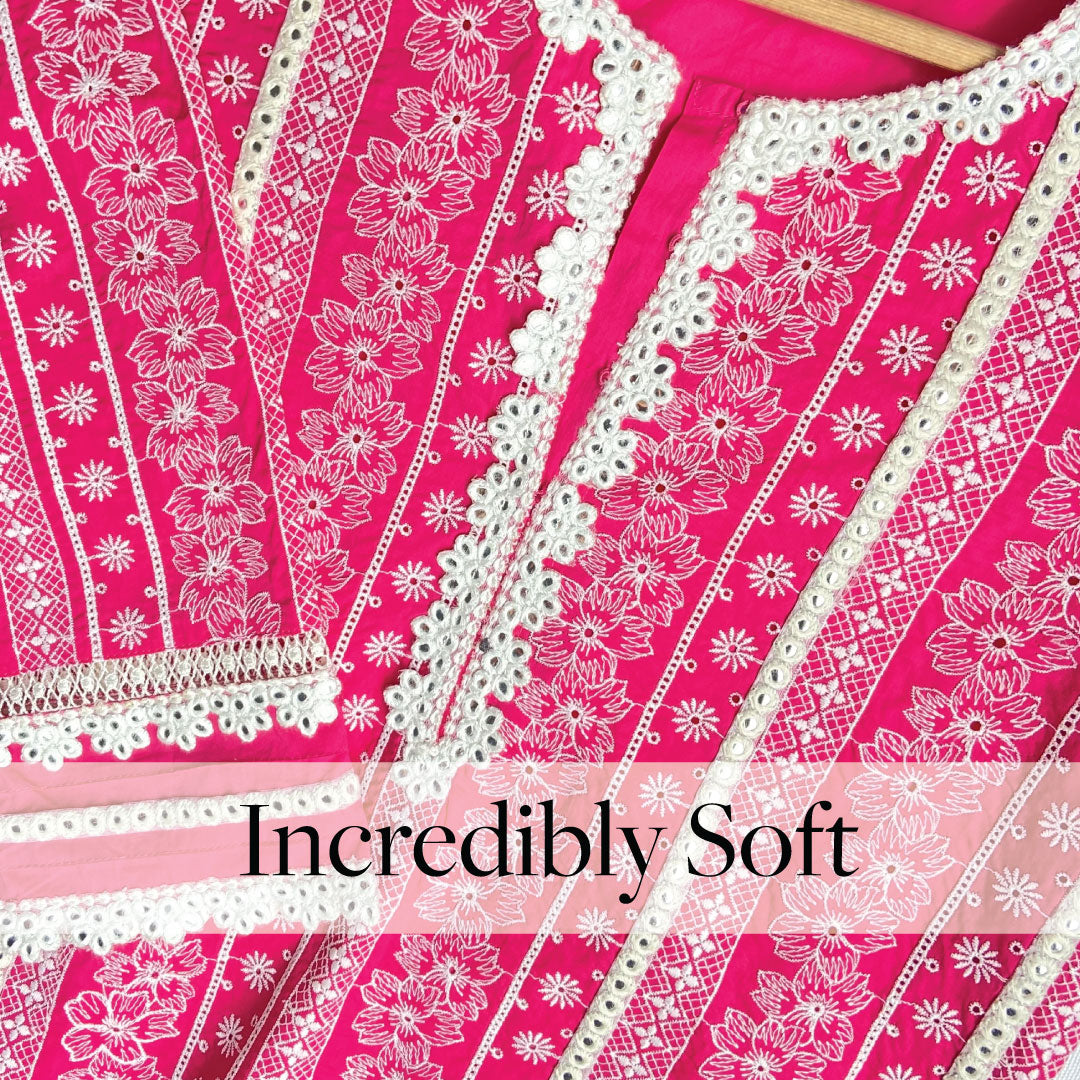 The Patricia set is one that goes all out while being sophisticated and subtle all at once, perfect for the mornings but equally well balanced for the evenings! The straight silhouette kurta has small vertical panels of a variety of embroidery through the length and is enhanced with the floral lace on the necklines and the hems. Finish the look with straight white pants of complimenting multi-lace detailing and the very pretty shiloh dupatta in the same shade.