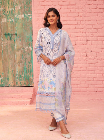 This pastel embroidered kurta set features a delicate balance of traditional charm and contemporary style. The kurta showcases intricate floral embroidery in soothing shades of soft pastels, creating a mesmerizing visual appeal. The V-neckline and placket are adorned with lace. The three-quarter sleeves are adorned with exquisite lace detailing. Complementing the kurta is a matching dupatta, decorated with subtle floral prints and a graceful border that elevates the overall look. Paired with comfortable straight-leg trousers featuring intricate lace trimming at the hem, this set is perfect for festive occasions and casual gatherings alike.