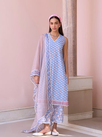 The Rajvella kurta set in Orange features a sleeveless kurta with dainty booti motifs and finished with ladder lace, a contrast border, and a side slit with a tie-up detail, complete with thread and shell tassels. It's styled with matching straight-fit pants printed in a mix of gadh motifs. A soft leheriya-inspired striped organza dupatta with lace and printed border detailing brings the full look together.