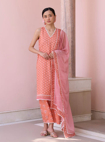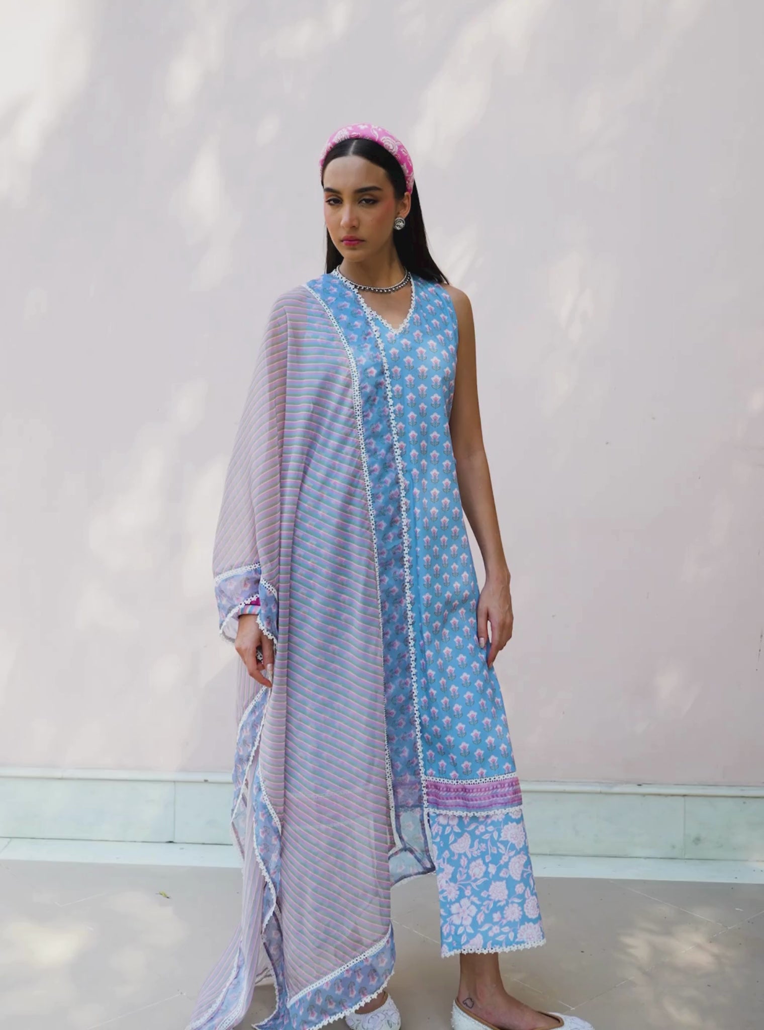 The Rajvella kurta set in Steel Blue features a sleeveless kurta with dainty booti motifs and finished with ladder lace, a contrast border, and a side slit with a tie-up detail, complete with thread and shell tassels. It's styled with matching straight-fit pants printed in a mix of gadh motifs. A soft leheriya-inspired striped organza dupatta with lace and printed border detailing brings the full look together.