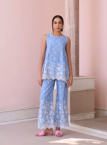 The Zeenat top set in Pink is a breezy update on everyday co-ords. Made in lightweight mulmul cotton, the sleeveless top features gadh and booti placements, with delicate scalloped boring embroidery along the hem and a keyhole detail at the back. It's paired with straight-fit pants featuring side slits, a bold geometric border, and matching scalloped edging for that extra-soft finish.