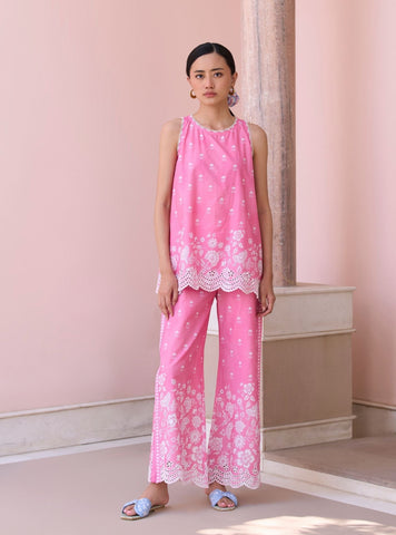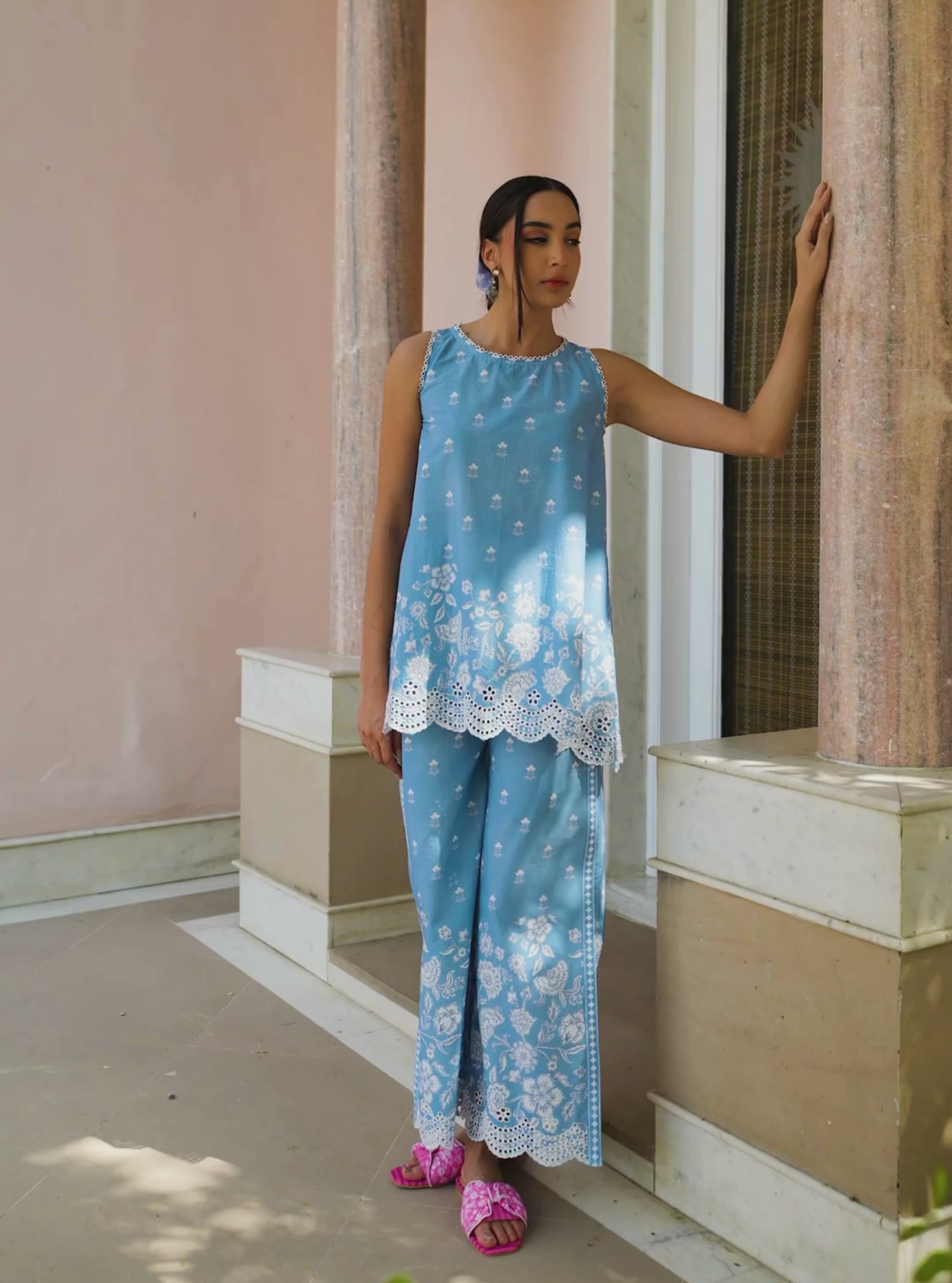 The Zeenat top set in Blue is a breezy update on everyday co-ords. Made in lightweight mulmul cotton, the sleeveless top features gadh and booti placements, with delicate scalloped boring embroidery along the hem and a keyhole detail at the back. It's paired with straight-fit pants featuring side slits, a bold geometric border, and matching scalloped edging for that extra-soft finish.