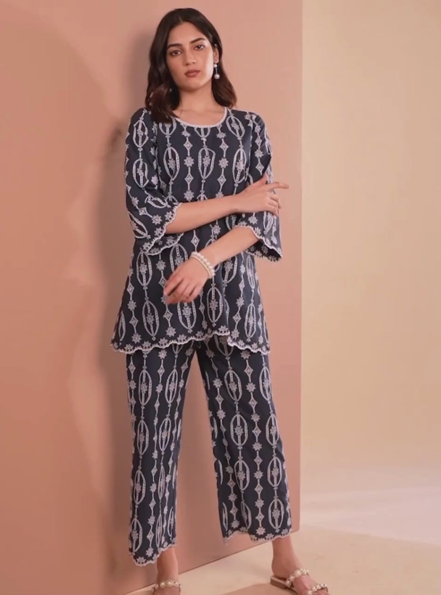 Effortlessly chic, this rich navy co-ord set is a versatile addition to your summer wardrobe. Adorned with contrasting white thread line embroidery all over, it features lace detailing around the neckline and scalloped sleeves and hem.Whether you're heading to the office or enjoying a leisurely brunch with friends, this versatile ensemble effortlessly transitions to suit any occasion. With its timeless elegance and adaptability, this co-ord set promises to be a staple in your wardrobe rotation.
