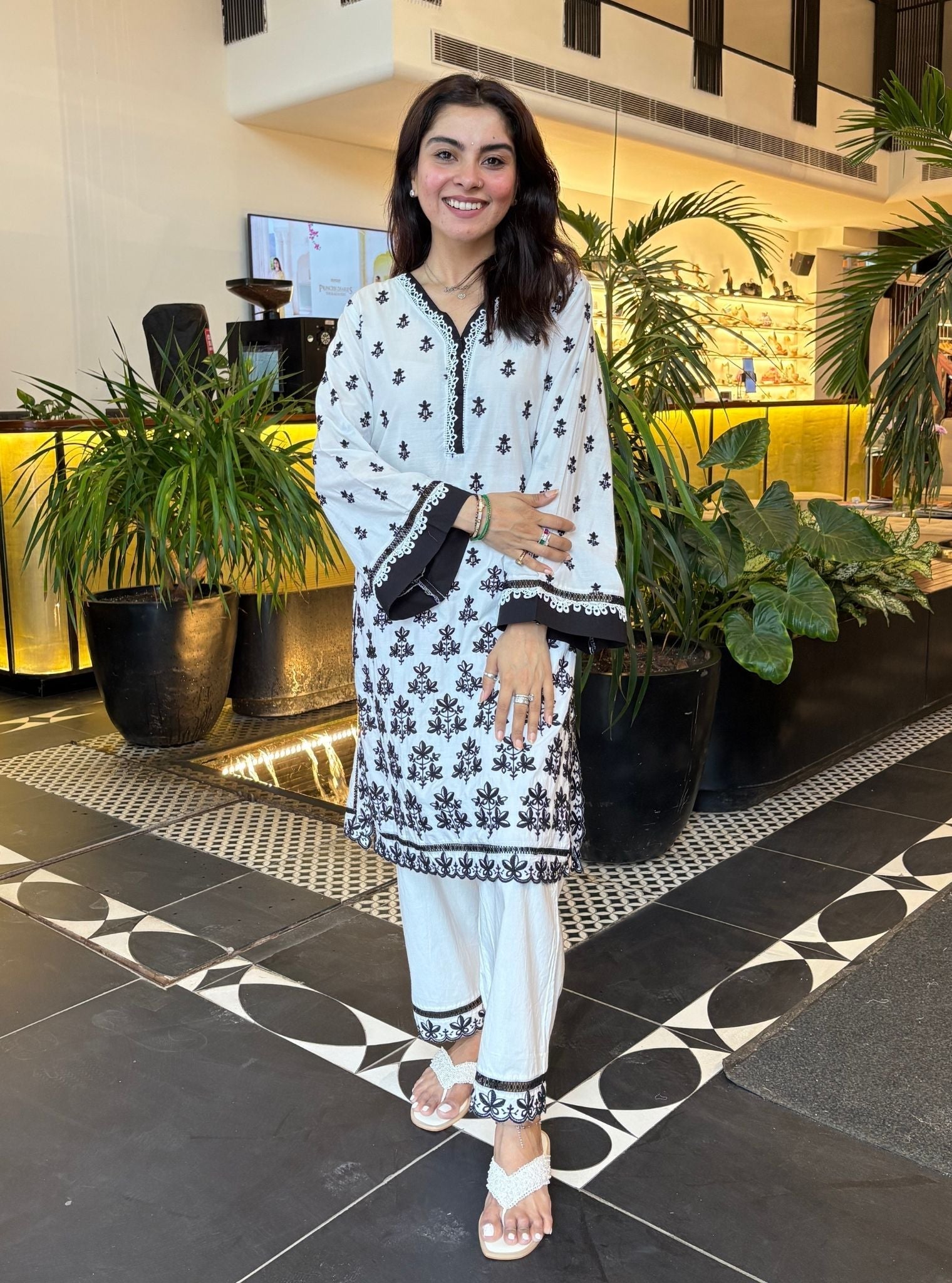 Experience effortless summer sophistication in this timeless black-and-white kurta set. Crafted from a lightweight and breathable cotton, this ensemble is designed to keep you comfortable in the heat. The kurta is adorned with delicate black floral motifs, intricately embroidered to create a striking contrast against the pristine white base. The relaxed silhouette features a V-neckline and three-quarter sleeves. A beautifully embroidered border runs along the hemline and sleeve edges, creating a refined finish. The kurta is paired with crisp white straight-cut pants, featuring matching embroidered detailing at the hem. The look is accentuated by a black dupatta adorned with coordinated floral patterns.