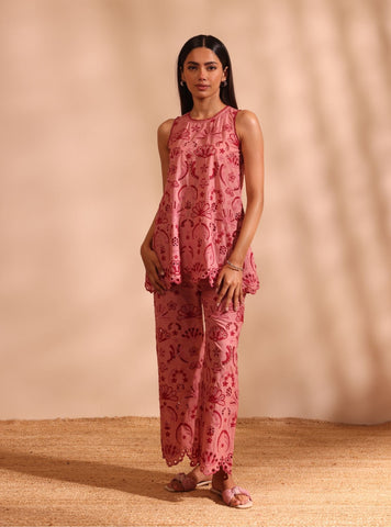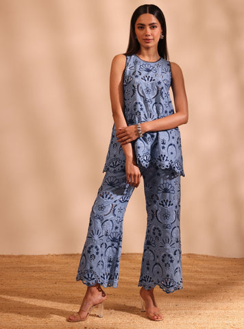 The sleeveless top features a clean round neckline and a flared silhouette, making it both flattering and breathable for warmer days. Paired with straight-cut pants, the set showcases intricate all-over embroidery in delicate white and blue threads, creating a breezy floral mosaic that feels like sunshine in motion.