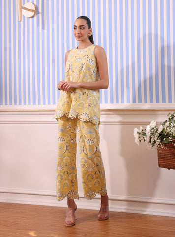 The sleeveless top features a clean round neckline and a flared silhouette, making it both flattering and breathable for warmer days. Paired with straight-cut pants, the set showcases intricate all-over embroidery, creating a breezy floral mosaic that feels like sunshine in motion.