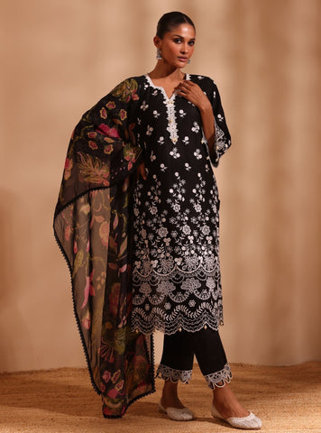 Play of poise and symbol of simplicity, the pristine white kurta set is an endearing ensemble for your all-year-round wardrobe. It imparts a sense of understated elegance to the wearer. The notched neckline is accentuated with lace trim and delicate pearl hangings. With delicate eyelet embroidery all over and a scalloped hem, this is for the minimalist in you. Paired with straight pants, the main talking point of the set is its dupatta - a stunning printed masterpiece with a broad lace border.
