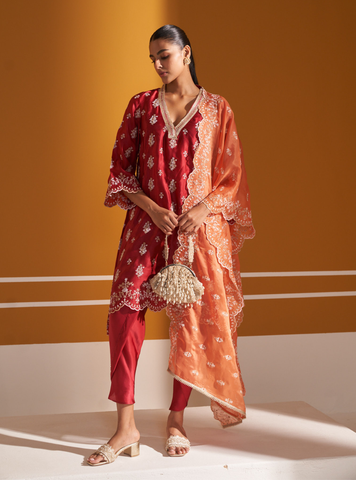 Dress it up with the contrasting dupatta with white embroidery and scalloped edges.
