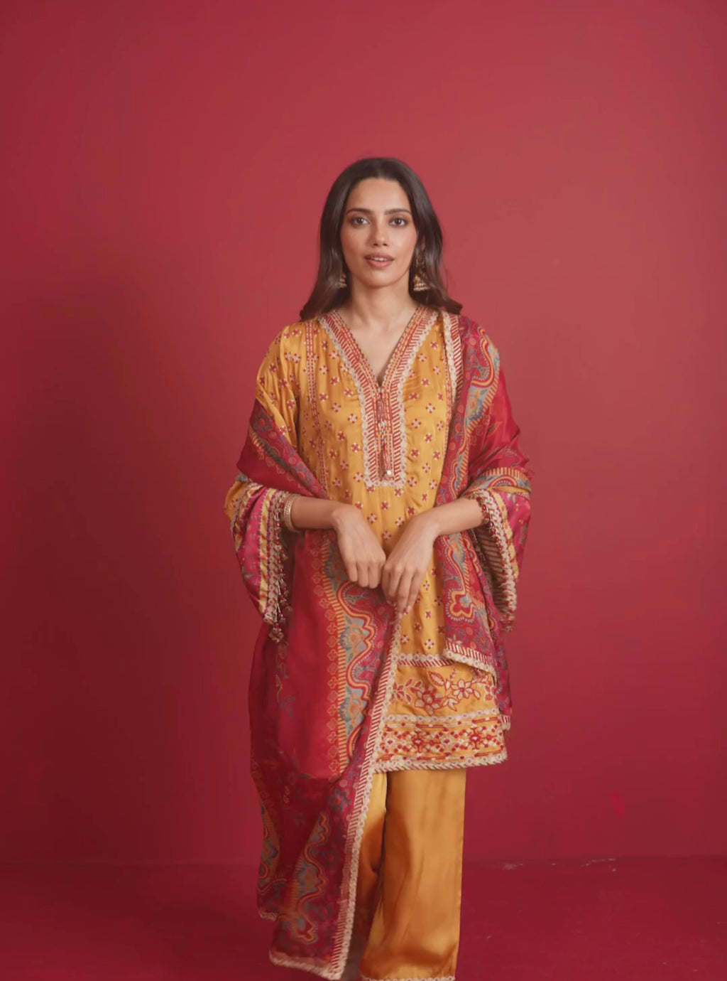 Sunny mustard in glossy cupro satin makes this straight kurta set a festive classic. Paired with satin pants and a deep red habutai dupatta, it strikes the perfect note of tradition with a modern edge.