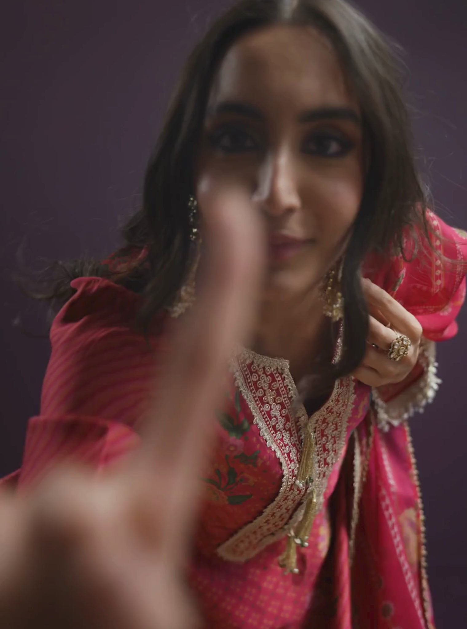 Bright and bold, this red printed kurta set in cupro satin is paired with straight pants and a lightweight organza dupatta. A standout festive ensemble.