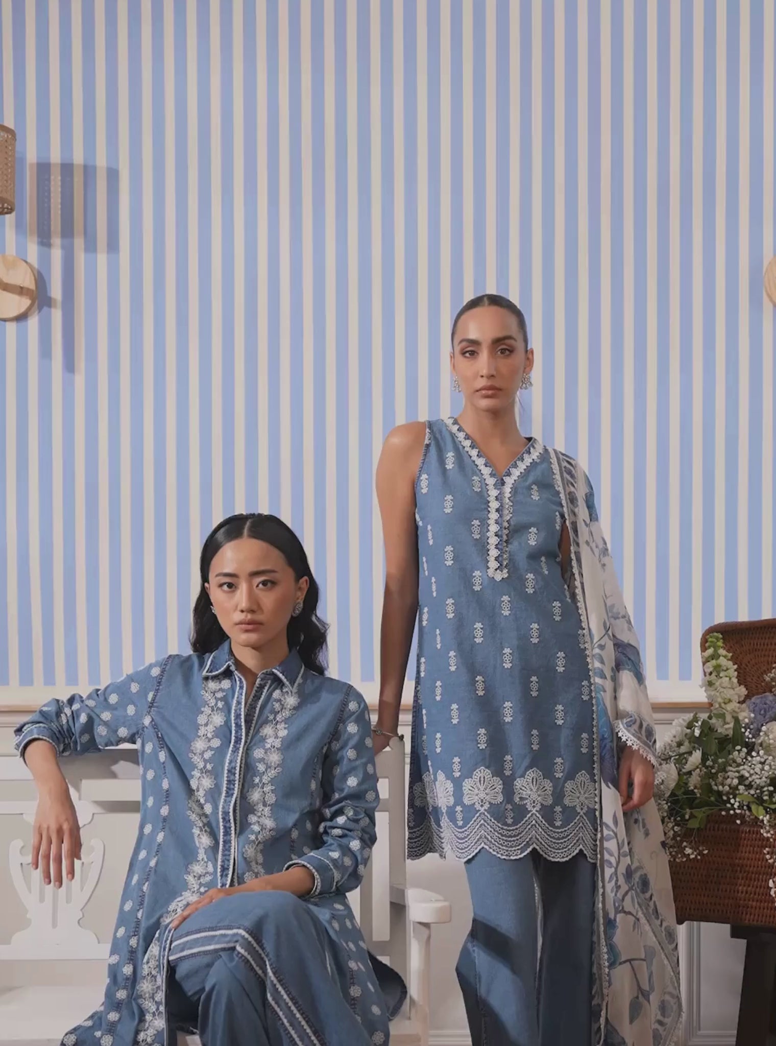 A seamless blend of modern denim and traditional details, this sleeveless kurta set is where ease meets elegance. The set features a V-neck kurta in soft blue denim, adorned with delicate white embroidery that cascades down the front and blooms into a beautifully scalloped hemline. The fine detailing adds a graceful charm, while the relaxed, straight-cut silhouette keeps it effortless and versatile. Paired with matching denim straight pants that mirror the kurta’s embroidery along the hem, the ensemble is completed by an organza dupatta, delicately printed in complementing blue and white florals.
