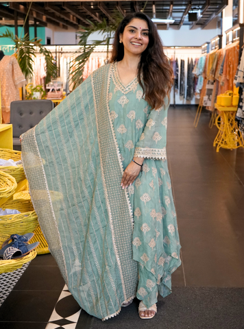 Dive into a sea of elegance with this tranquil teal blue Anarkali set. The vibrant teal hue, reminiscent of serene waters, is beautifully complemented by intricate embroidery that flows across the entirety of the fabric. The V-necklinethree-quarter sleeves are juxtaposed against the asymmetrical hemline of the kurta, making it the perfect blend of tradition and contemporary flair, fit for a sangeet or evening wedding event. The matching dupatta, with its ornate detailing, drapes effortlessly, adding a touch of majesty to your look. Step into this Anarkali set, and let your tranquil beauty take center stage.