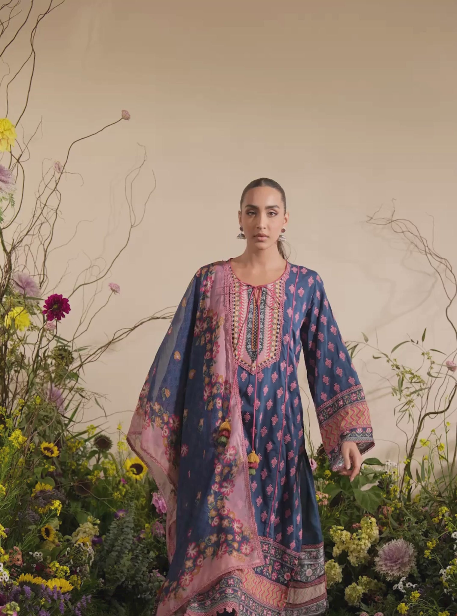 The regal ensemble is completed with an organza dupatta— blooming with floral prints in pink and coral, balancing the structured silhouette of the kurta with a soft, romantic layer.