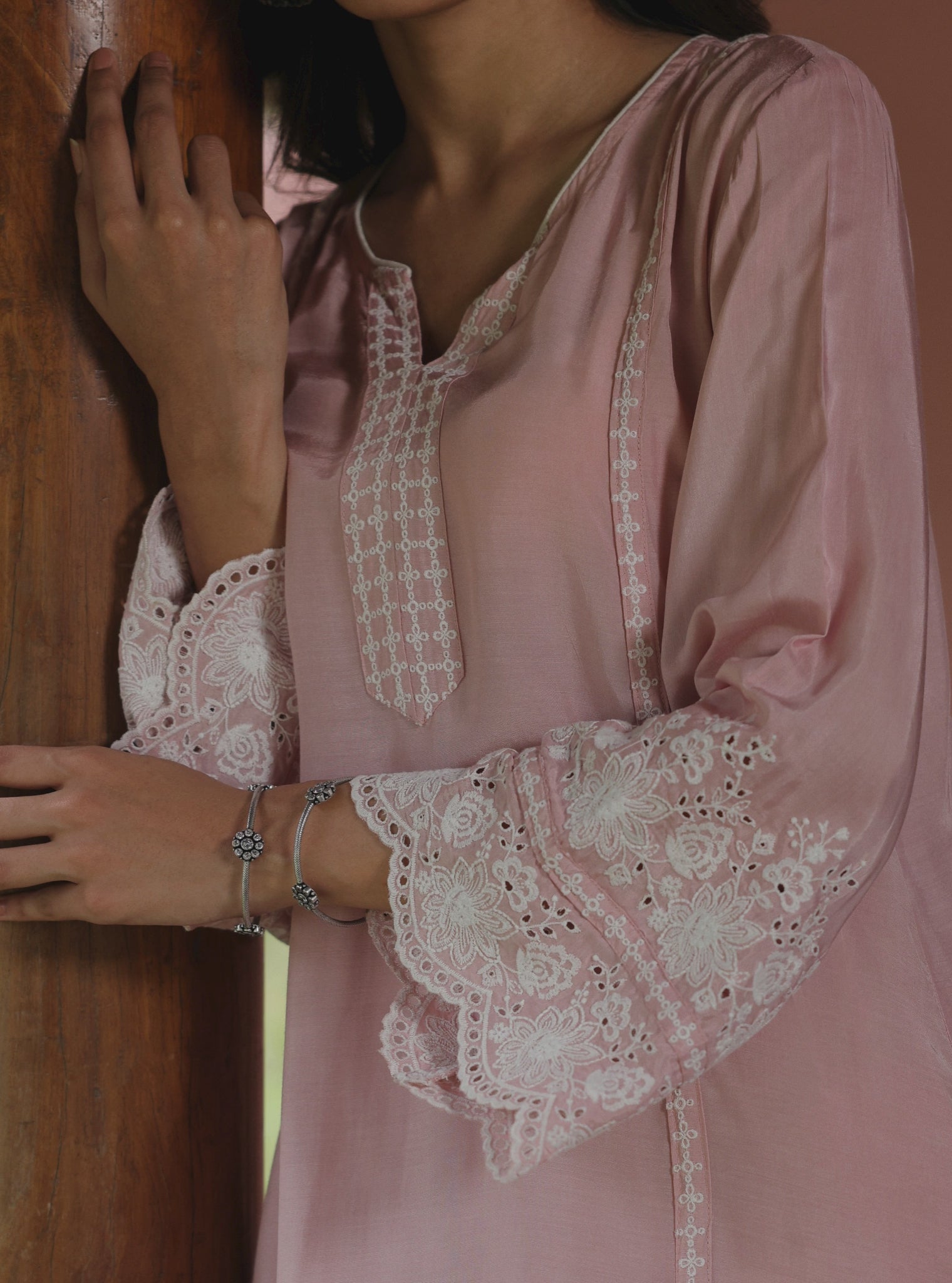 Delicate, dreamy, and designed for days when you want to look effortlessly elegant—this soft pink kurta set is the epitome of understated charm. The fluid silhouette is adorned with dainty lace trims along the neckline, cuffs, and hem, lending it a vintage-inspired allure.