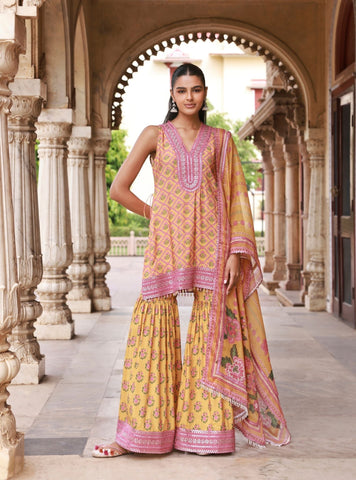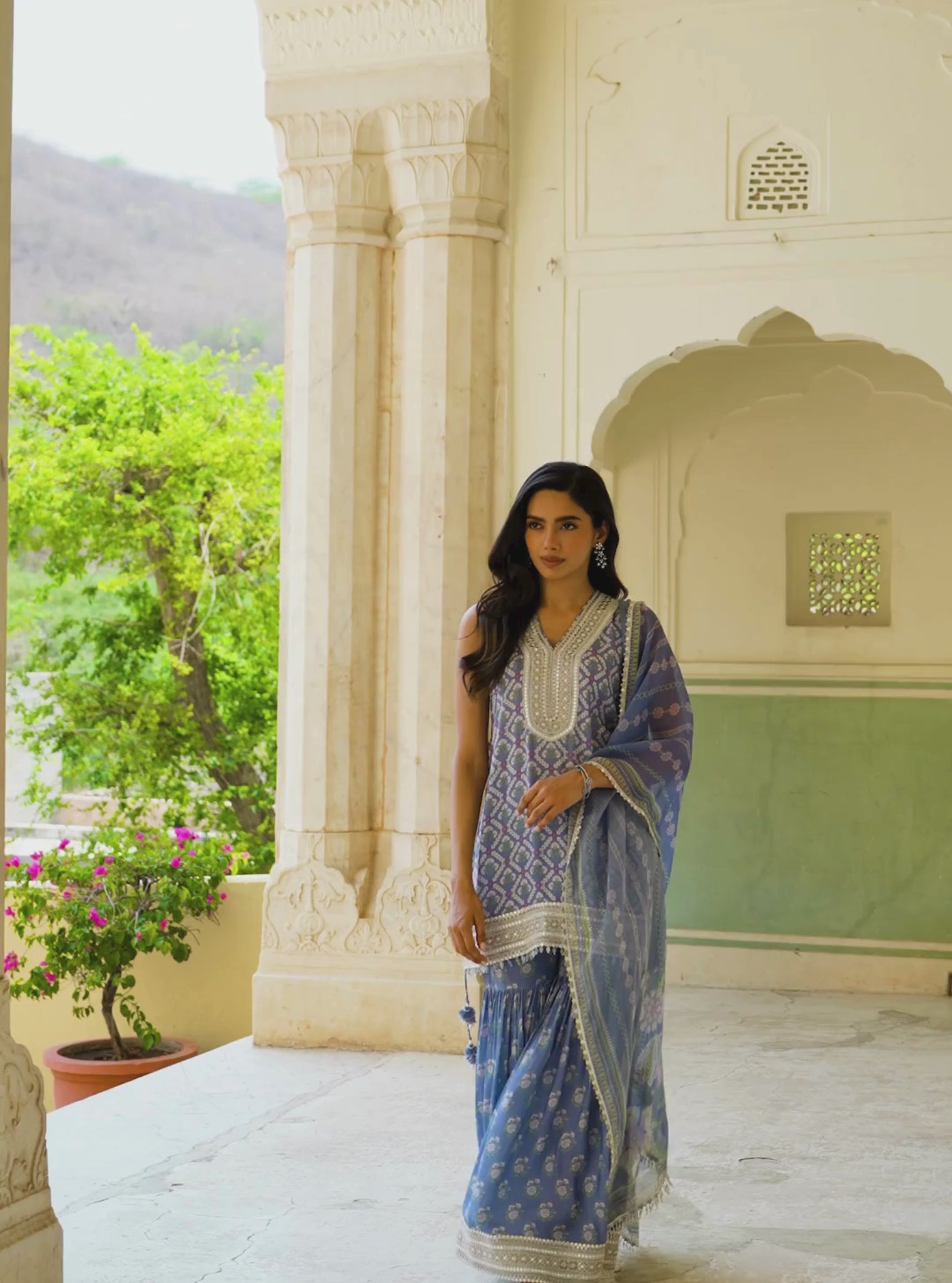 The Divaya Denim Kurta Set pairs Mughal-inspired prints with a contemporary silhouette. The sleeveless lawn kurta features a deep V-neckline embellished with thread and mirror embroidery, framed by lace borders. Paired with a voluminous sharara-style pant in matching print and tonal detailing at the hem, the look is full of movement. A printed organza dupatta in soft blue tones with scalloped lace completes this fresh take on festive dressing.