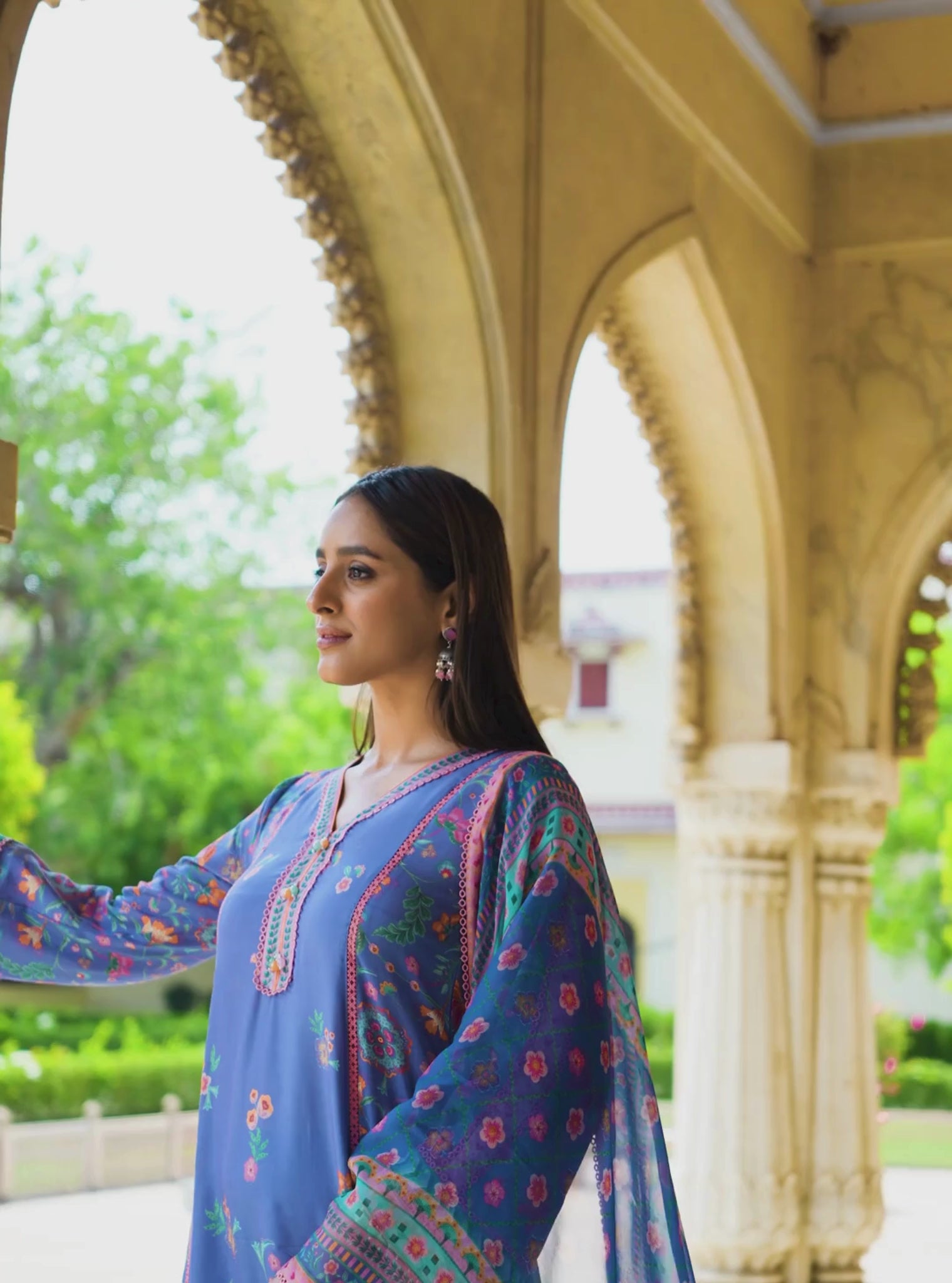 Paired with tonal cotton pants embroidered at the hem, the outfit is completed with a breezy printed dupatta trimmed with dainty lace, adding a gentle layer of texture and charm.