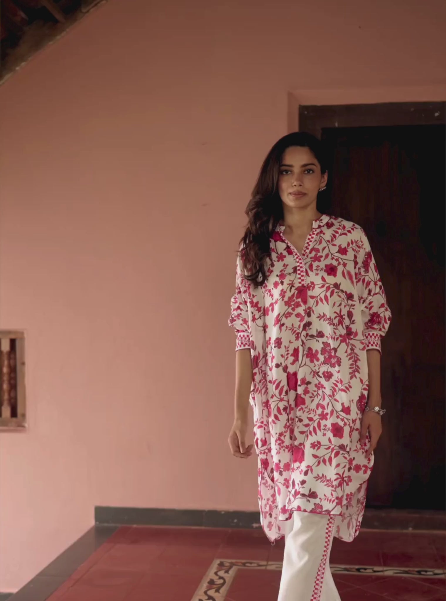 This breezy and contemporary kurta set is a perfect pick for casual, laid-back summer days. The kurta is designed on a fresh white base, featuring bold fuchsia floral prints that create a visually striking contrast. The intricate blooms in shades of fuchsia and red aare both elegant and calming, bringing a serene vibe to the piece.