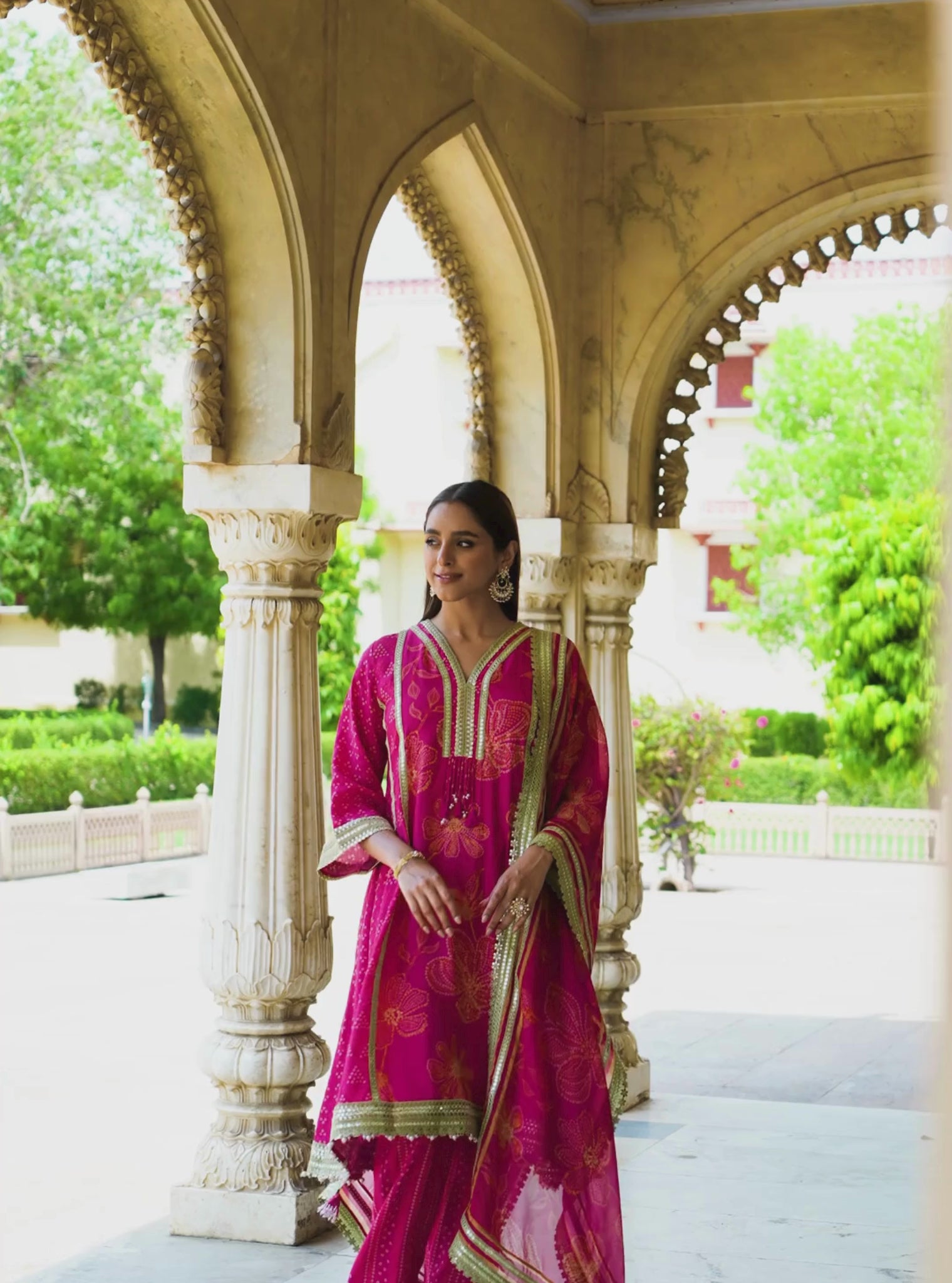 Ethereal in fuschia, the Vrishti Set is embroidered with oversized floral motifs and elevated with lace-detailed sleeves, organza dupatta, and gold gota trims. The airy organza kurta is paired with printed pants, making it the perfect choice for daytime gatherings with a touch of grace.