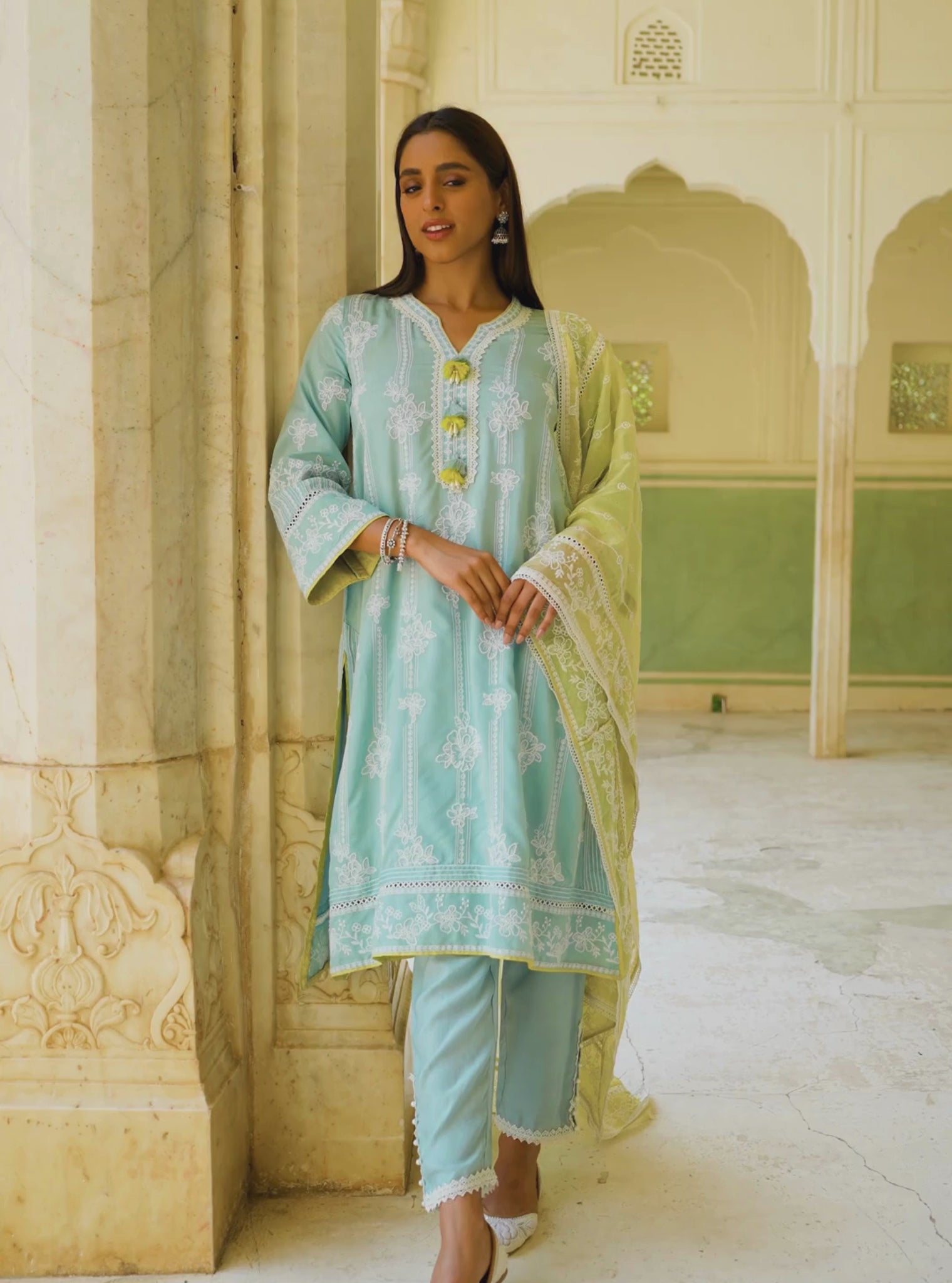 The Rimeli Kurta Set brings a soothing touch to festive dressing with its soft blue hue and delicate details. Designed in a straight kurta silhouette, it features fine thread embroidery blooming across the front and sleeves, with subtle lace accents at the neckline for added charm. The three-quarter sleeves complete the look with a hint of grace.