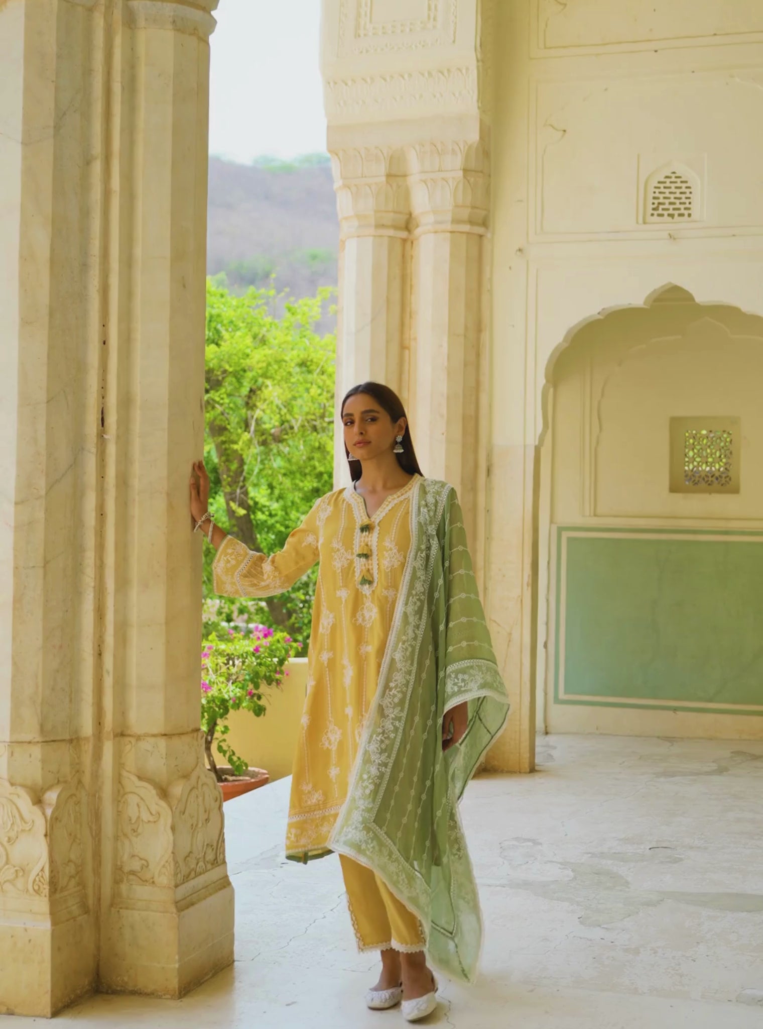 Tonal cotton pants with embroidery at the hem add just the right touch of detail, while the printed dupatta, light, airy, and edged with lace-completes the look with grace.