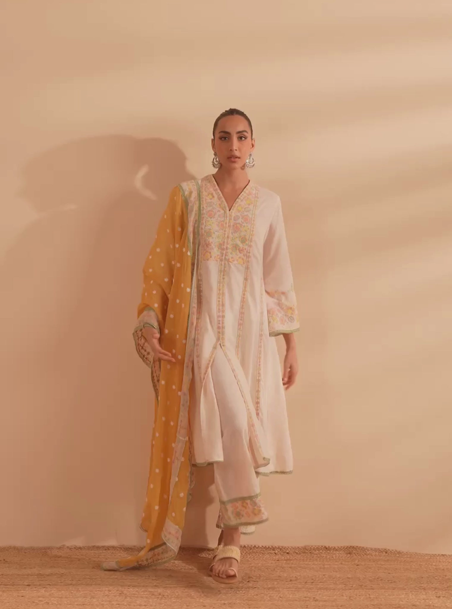 The set is paired with straight pants with embroidered borders at the hem. Adding a vibrant contrast to the muted ivory is the yellow dupatta, adorned with delicate embroidery and bordered with floral detailing, infusing the outfit with a cheerful warmth.