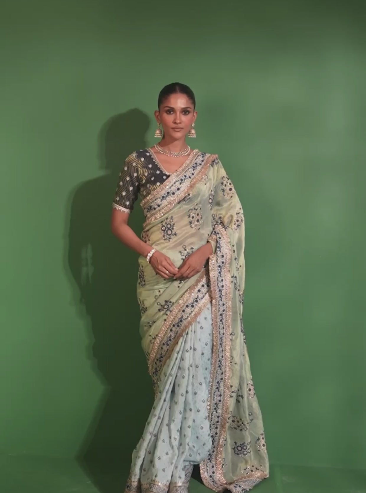 Step into an era of understated luxury with this light blue embroidered saree, a masterpiece of classic artistry and contemporary finesse. Crafted from sheer, lightweight organza banarasi, this drape flows effortlessly, exuding a delicate charm that is both regal and ethereal. The soft blue base is adorned with intricate floral and geometric embroidery in zari, accentuated by hints of sequins for a subtle shimmer. The broad embroidered border, featuring elaborate motifs and traditional patterns, adds a touch of grandeur, making this saree perfect for wedding soirées and festive celebrations.