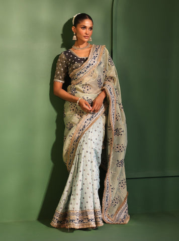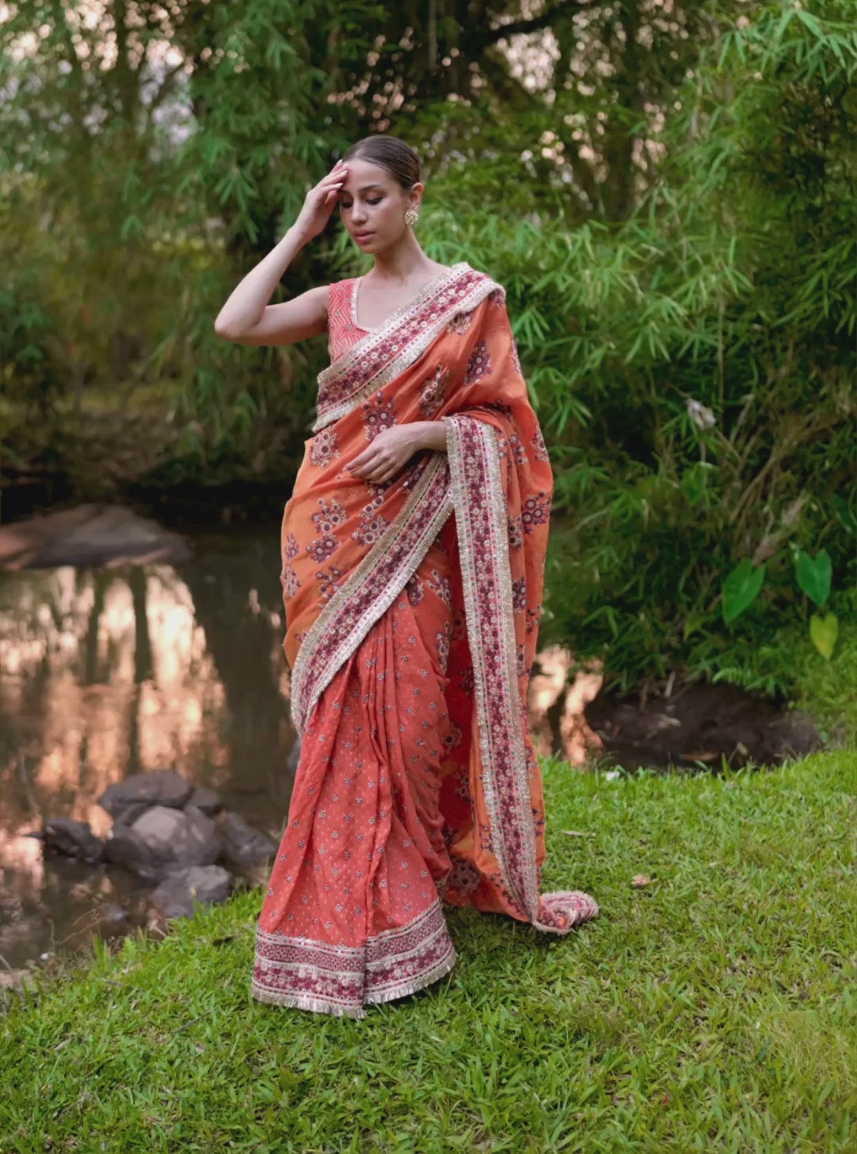 Draped in the warmth of earthy rust-orange hues, this embroidered saree is a poetic blend of tradition and contemporary charm. Crafted from lightweight, yet regal organza banarasi, it embodies effortless grace, making it perfect for both festive and casual luxe occasions.
