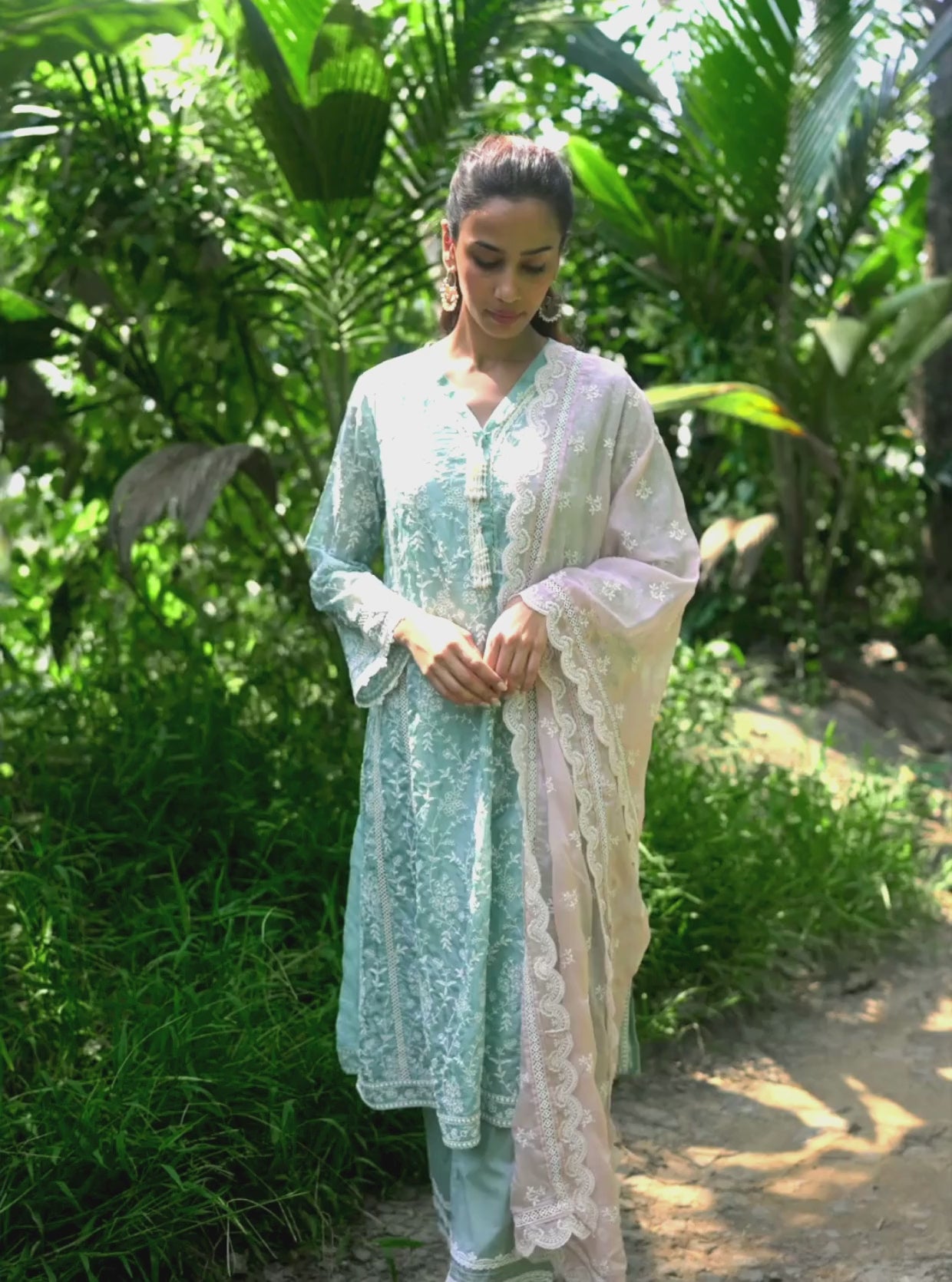 This kurta set in a refreshing shade of teal blue is a stunning choice for intimate summer festivities. Made from breathable organza, the kurta features intricate floral and vine embroidery that stands out beautifully against the cool teal backdrop. The V-neckline is adorned with delicate lace detailing and playful tassels. The three-quarter sleeves, finished with scalloped lace edges, enhance the airy and lightweight appeal of the ensemble.