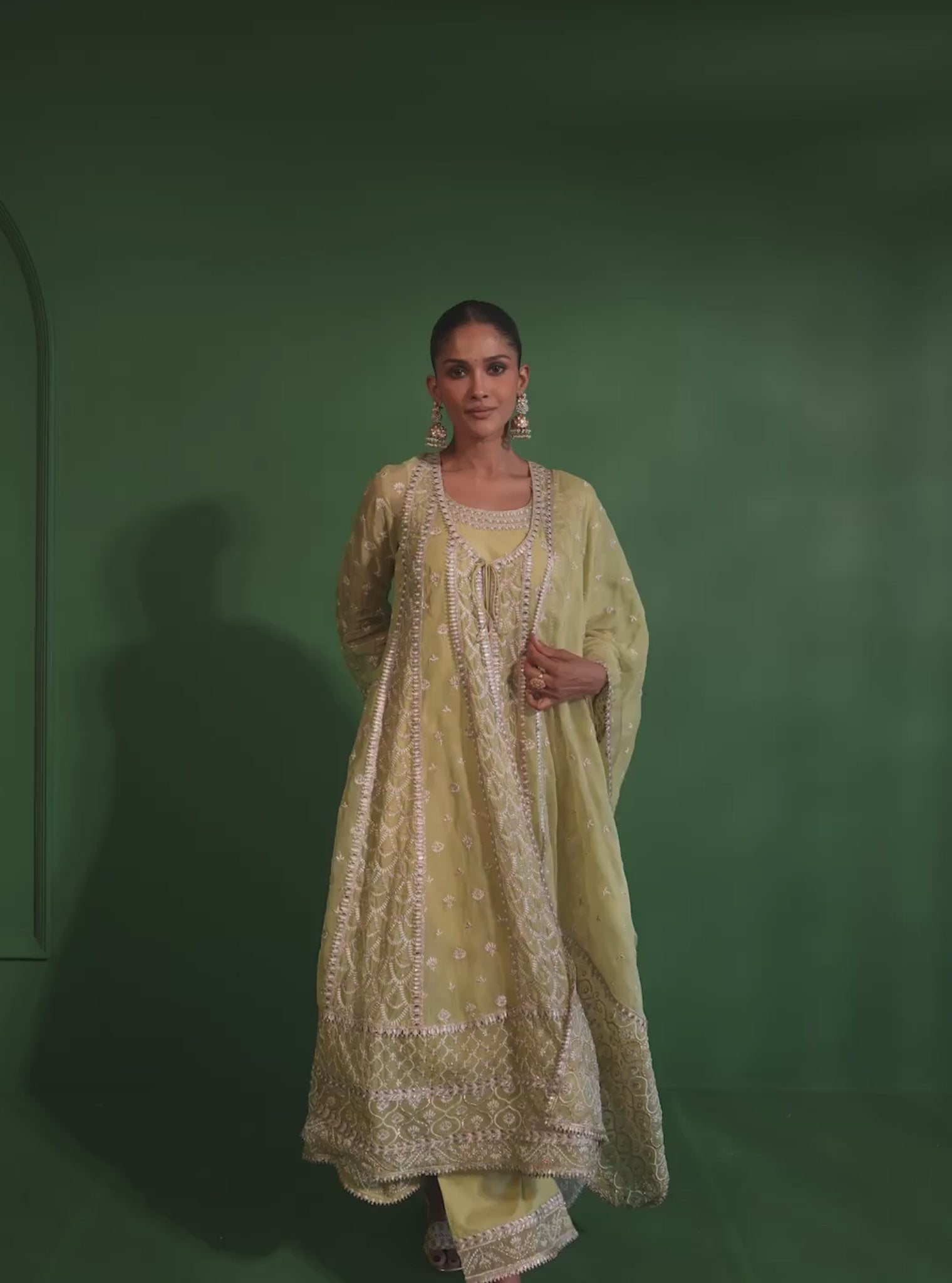 Mulmul Organza Dilruba Lime Green Anarkali Kurta With Mulmul Pima Satin Dilruba Lime Green Pant