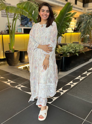 Indulge in the ethereal charm of this enchanting pink organza kurta set, adorned with intricate white thread embroidery throughout. The kurta has a graceful round neckline adorned with a charming tie-up detail and an embroidered yoke.?ÿ