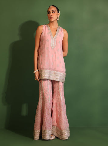 The highlight of this set is the flared sharara pants, designed with an opulent embroidered border that accentuates their voluminous silhouette. The alternating embroidered panels lend an ethereal grace, while the fluidity of the fabric ensures a flattering drape with every movement.