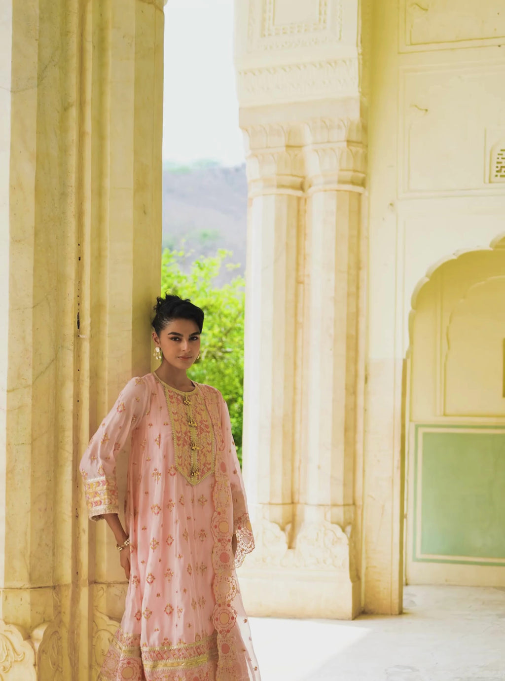 It’s paired with matching cotton pants detailed with embroidery at the hem, adding quiet sophistication. The look is tied together with a pink organza dupatta; airy, embroidered, and edged with lace that sways with every step.