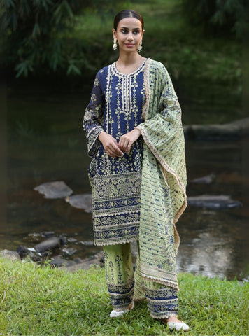 The matching pants feature complementing embroidery. Paired with a lightweight, intricately designed dupatta in shades of pink and gold, this ensemble is a radiant choice for festive occasions, weddings, or family gatherings.