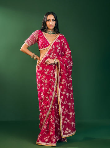 A sheer organza saree in regal purple, paired with a matching pima satin blouse. Lightweight yet rich in feel, it’s a piece that commands attention with subtle sheen.