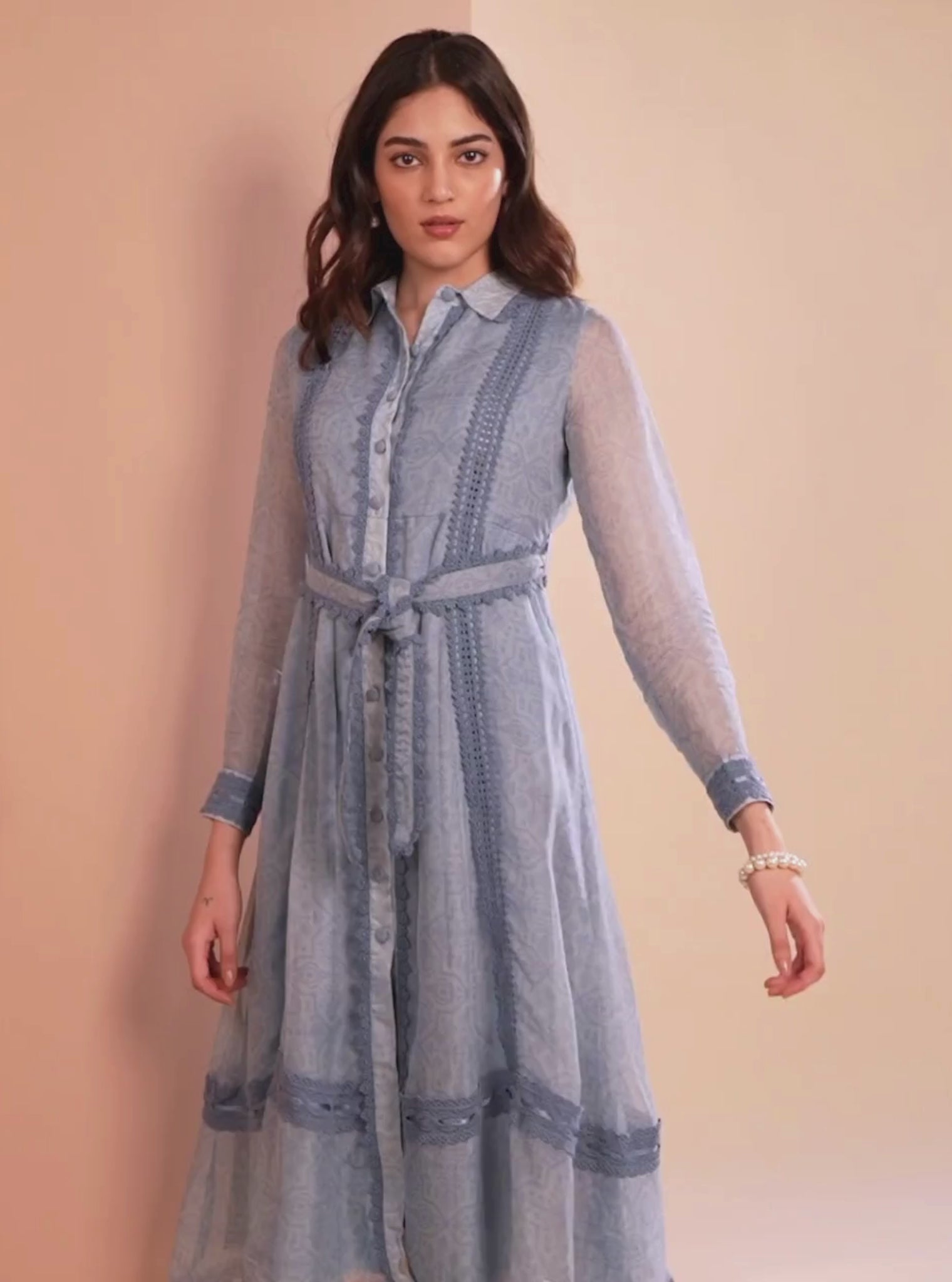 Crafted from exquisite organza fabric, this enchanting midi dress envelops you in a delicate shade of blue reminiscent of a fairytale wonderland. Adorned with intricate lace accents in a deeper shade of blue, the dress exudes sheer elegance. A refined collar adds a touch of sophistication, while a matching belt cinches the waist to perfection, ensuring a flattering silhouette.