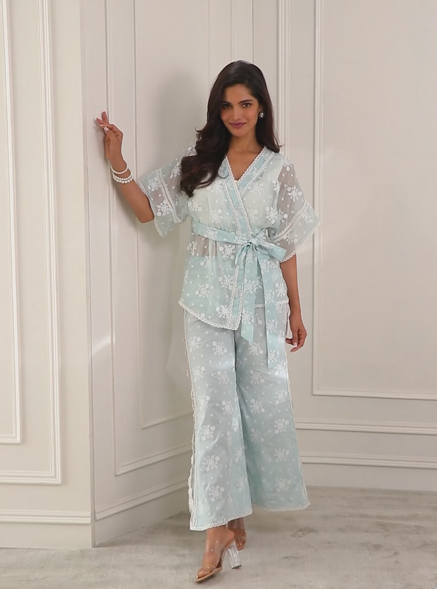 The Mila set in pure tencil organza is a delicate set that comes with a kimono-style top and flared pants. The set showcases tiny floral embroidery and bigger motifs with unique lace trims.