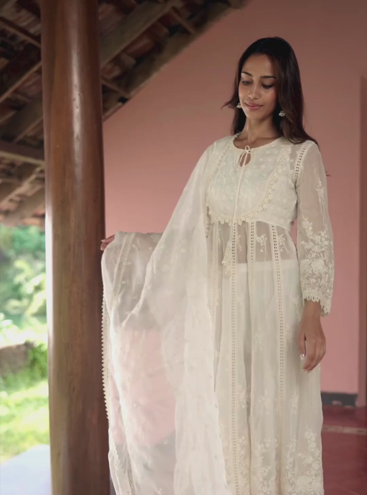Blushing in soft romance, this all-white Anarkali kurta set is a poetic blend of elegance and grace. Crafted in airy, breathable organza, the kurta features intricate self-embroidery delicately spread across the bodice, sleeves, and hemline, creating a dreamy, ethereal charm. The yoke is adorned with fine lace trims and a tassel tie-up. Paired with embroidered straight-leg pants that feature dainty lace edging, this set is perfect for the moments of romanticising summer.