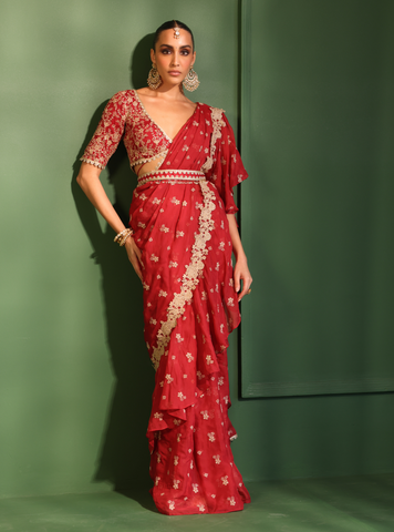 Drenched in the mystique of midnight hues, this navy blue pre-draped ruffle saree is a celebration of contemporary glamour and traditional finesse. Embellished with delicate floral embroidery in gold tones, the saree cascades with playful ruffle detailing along the pallu, adding a touch of drama and movement. The pre-draped silhouette offers ease of wear while maintaining the ethereal charm of a classic saree.
