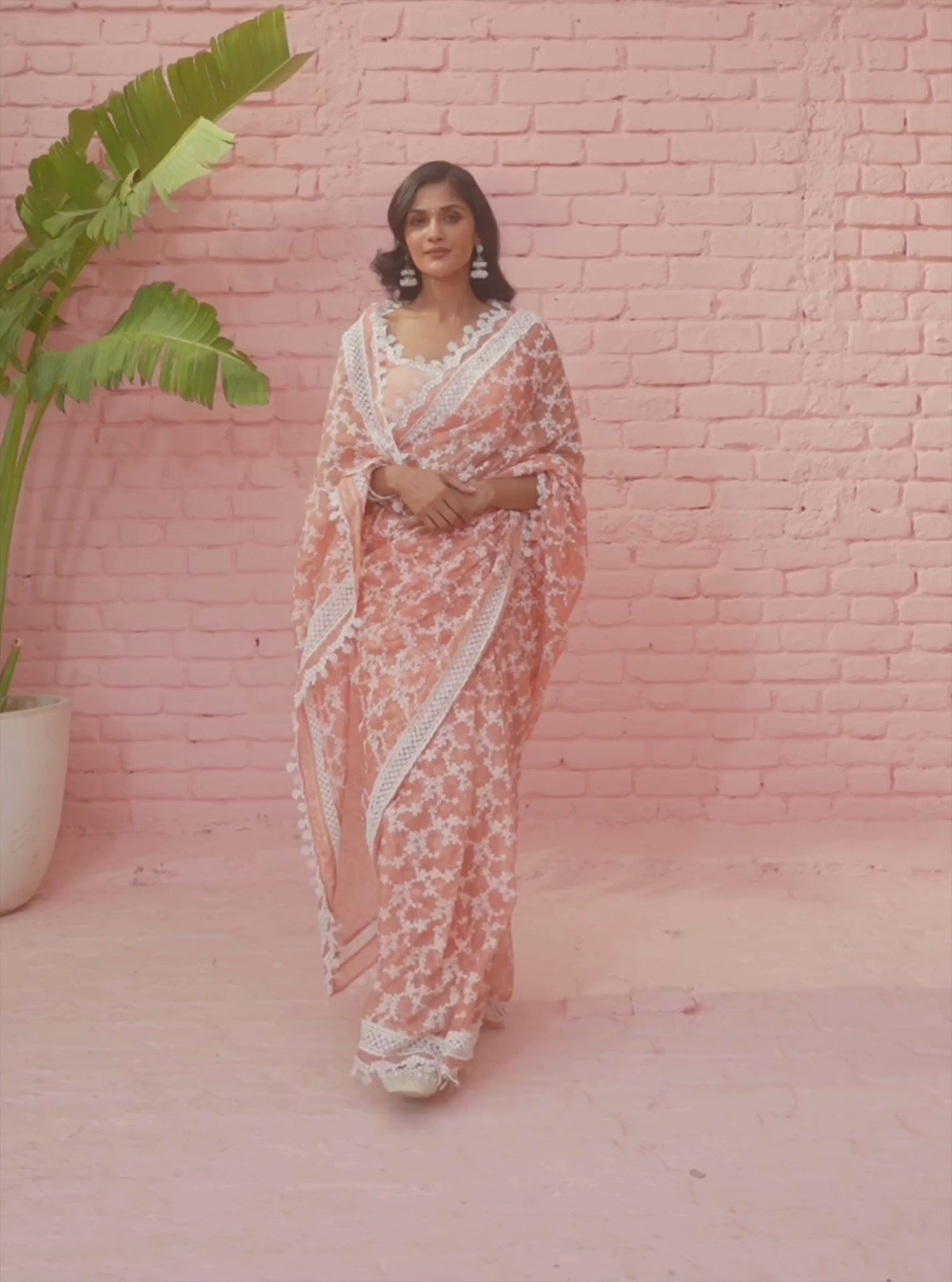 This elegant and delicate organza saree, in the Pantone Colour of the Year ƒ?? Peach ƒ?? is what summer fairytales are made of. Adorned in contrasting White thread embroidery all over, and completed by a beautiful lace border with scalloped edging, this saree is perfect for those summer days when you wish to unlock your soft desi-girl charm!