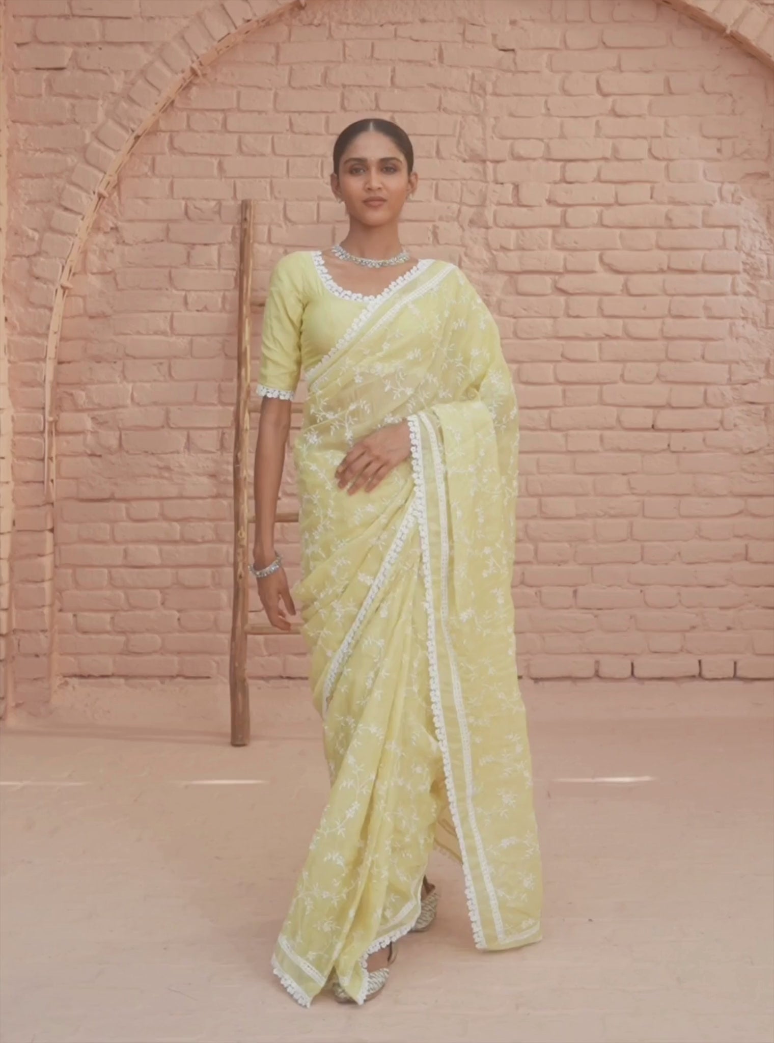 A summer lime shade, with delicate white thread embroidery all over, to create a subtle contrast. The light, breezy organza drapes like a dream and creates a stunningly flattering silhouette. Perfect for summer days, style this saree for casual brunches or intimate soirees. Unlock your soft glam era with this feminine masterpiece.