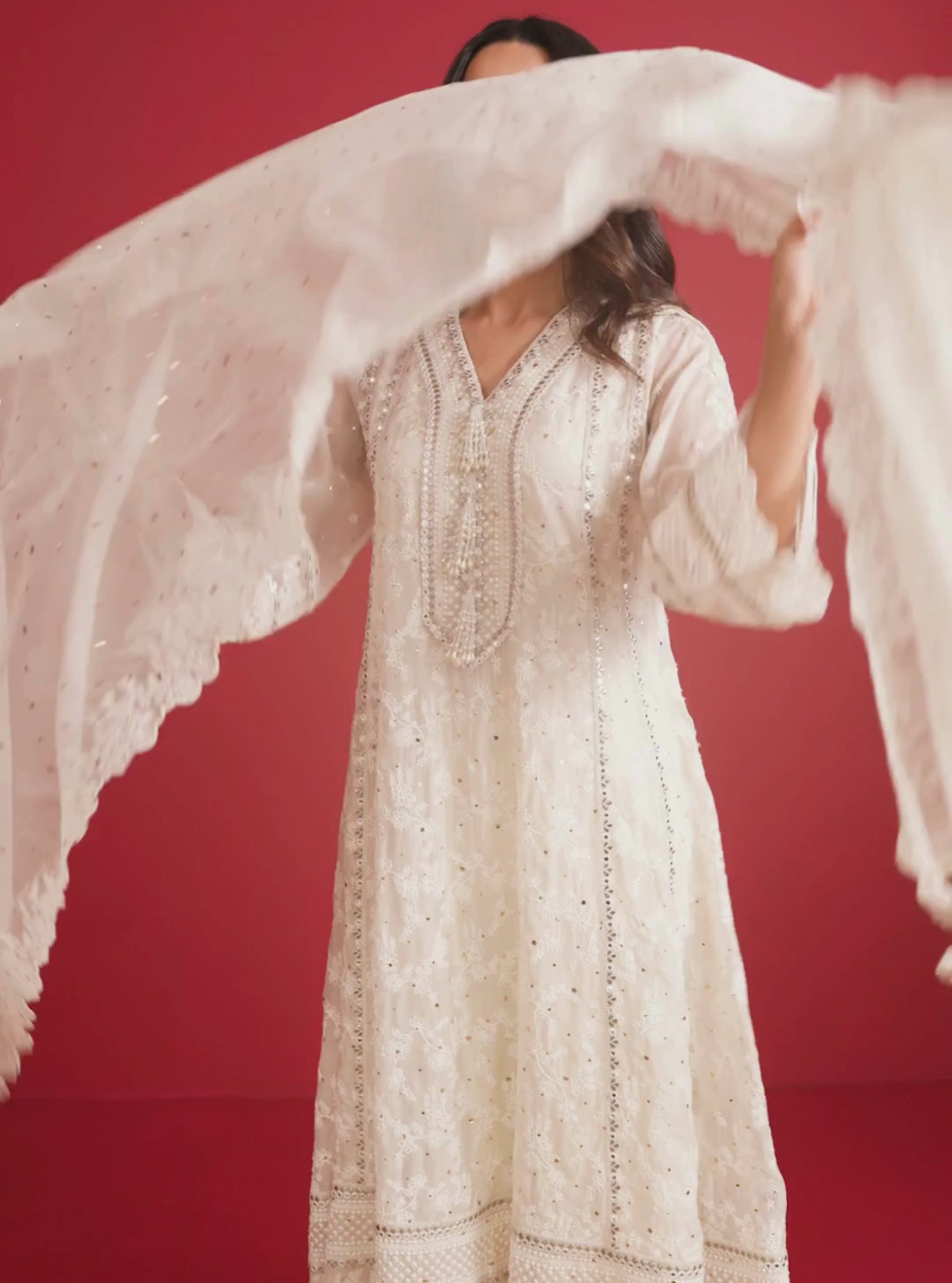 The Rupa Anarkali Set in Off White radiates timeless grace. The organza kurta features fine embroidery and lace detailing that highlight its flared silhouette. Worn with Pima Satin Pants and a matching Organza Dupatta, it's the perfect pick for serene festivities and elegant day celebrations.