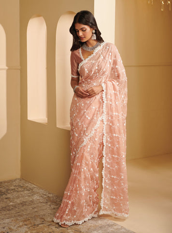 Delicate organza in a rich lavender is your perfect bet for the summer. As comfortable as it is elegant, this breezy saree drapes like a dream. Adorned with white thread embroidery all over, creating a subtle contrast, the saree is finished with a scalloped, lace-trimmed border. Style this saree effortlessly for summer days or evenings ƒ?? and become the talk of any gathering.