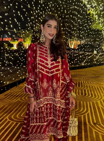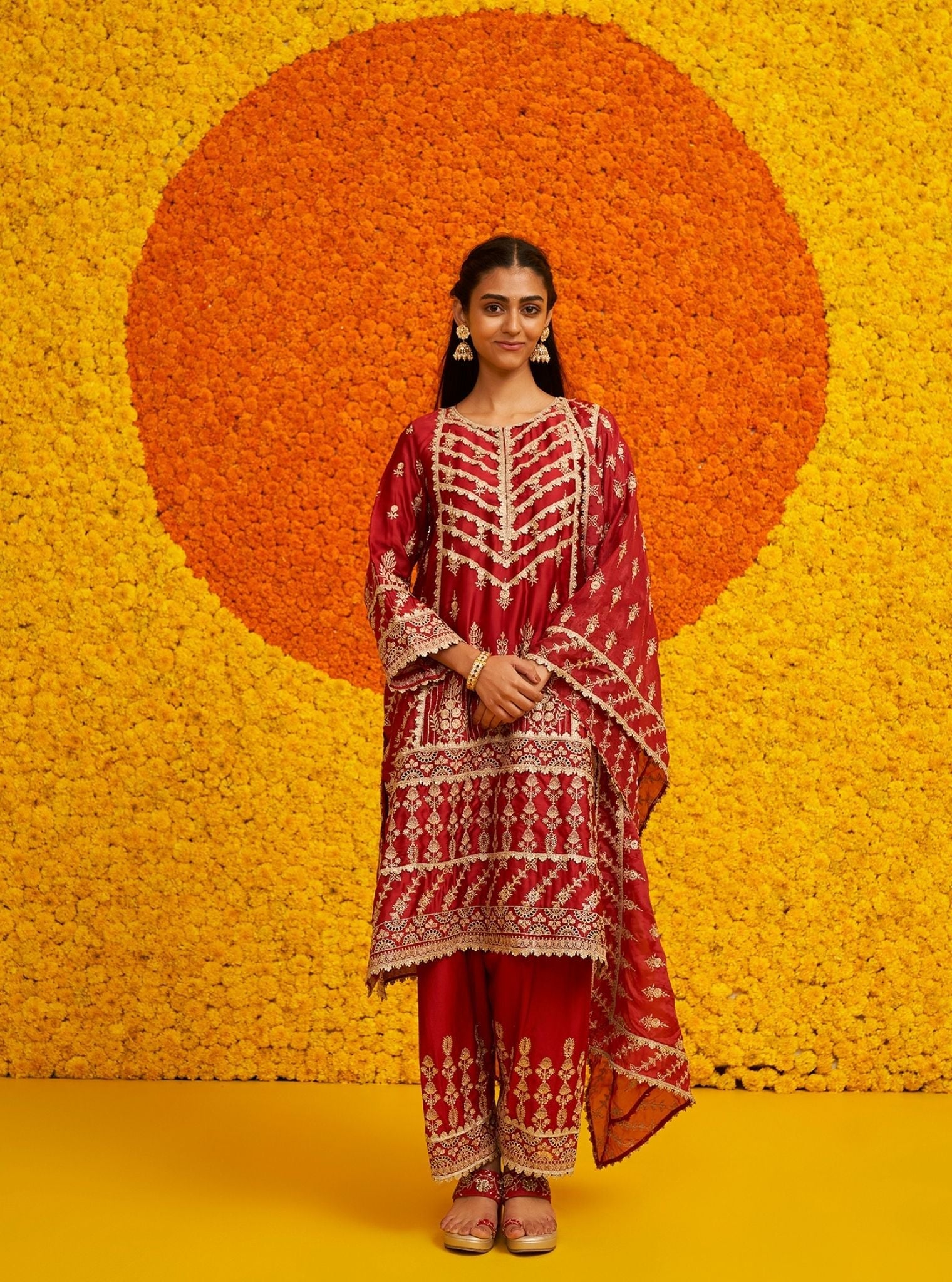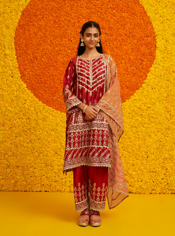 This stunning kurta set is the epitome of regal elegance, designed to dazzle at any Shaadi event. Crafted in a rich, deep red hue, the kurta is beautifully adorned with intricate gold zari embroidery and gotta work. The detailed patterns, reminiscent of traditional bridal motifs, make this ensemble perfect for wedding celebrations, whether you're the bride or a close family member. Paired with matching pants and a dupatta, both embellished with complementary embroidery, this set exudes a cohesive and polished look. The vibrant color and ornate design make it ideal for grand occasions, ensuring you make a memorable entrance - perfect for those who wish to embrace tradition while standing out in style.
