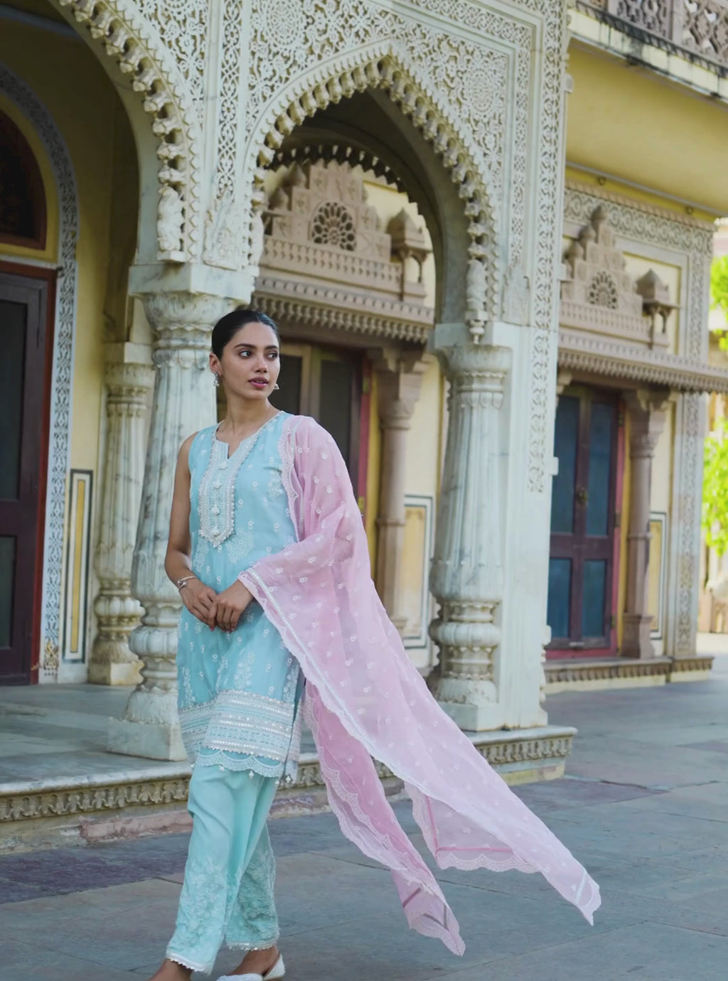 The Taveli Light Blue Kurta Set features an organza kurta embroidered with soft white thread and dainty mirror work. The lightweight cotton cami underneath ensures all-day comfort, while the straight-cut lawn pants offer subtle detailing at the hem. The look is tied together with a sheer pink organza dupatta featuring scalloped borders and floral bootis; made for sunlit rituals and sweet sisterhood.