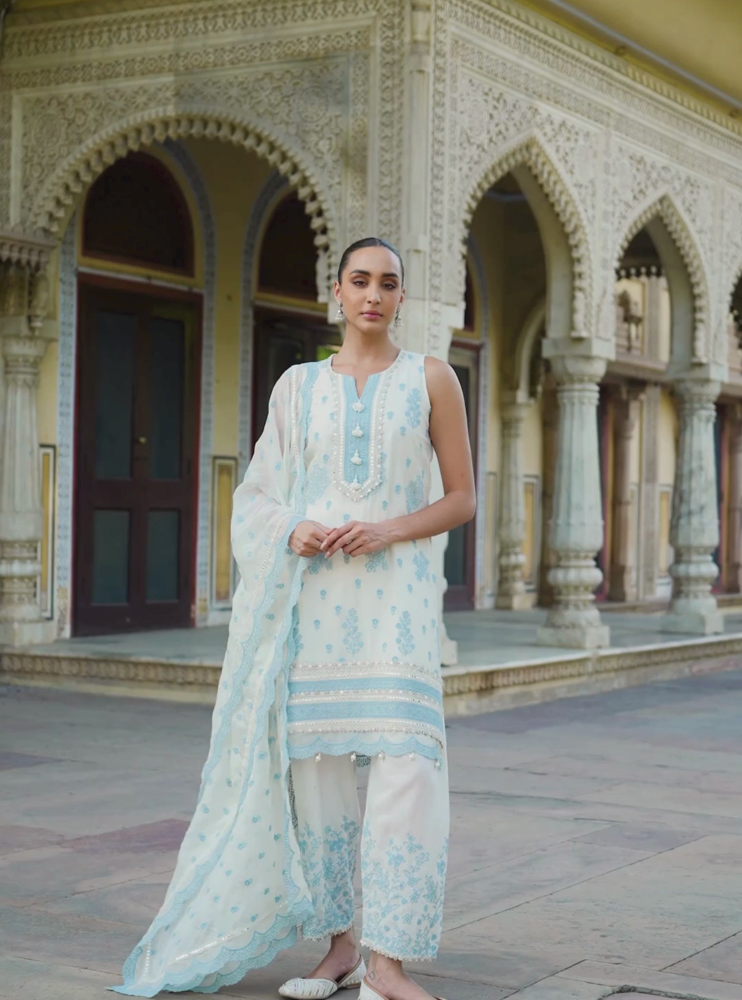 Classic with a twist, the Taveli Off-White & Blue Kurta Set is crafted in sheer organza and elevated with delicate blue-toned thread embroidery. A cotton cami adds comfort and coverage beneath, while tonal lawn pants with minimal embroidery keep it grounded. Finished with a blue-accented organza dupatta, this one's perfect for those who love minimalism with just a hint of colour.