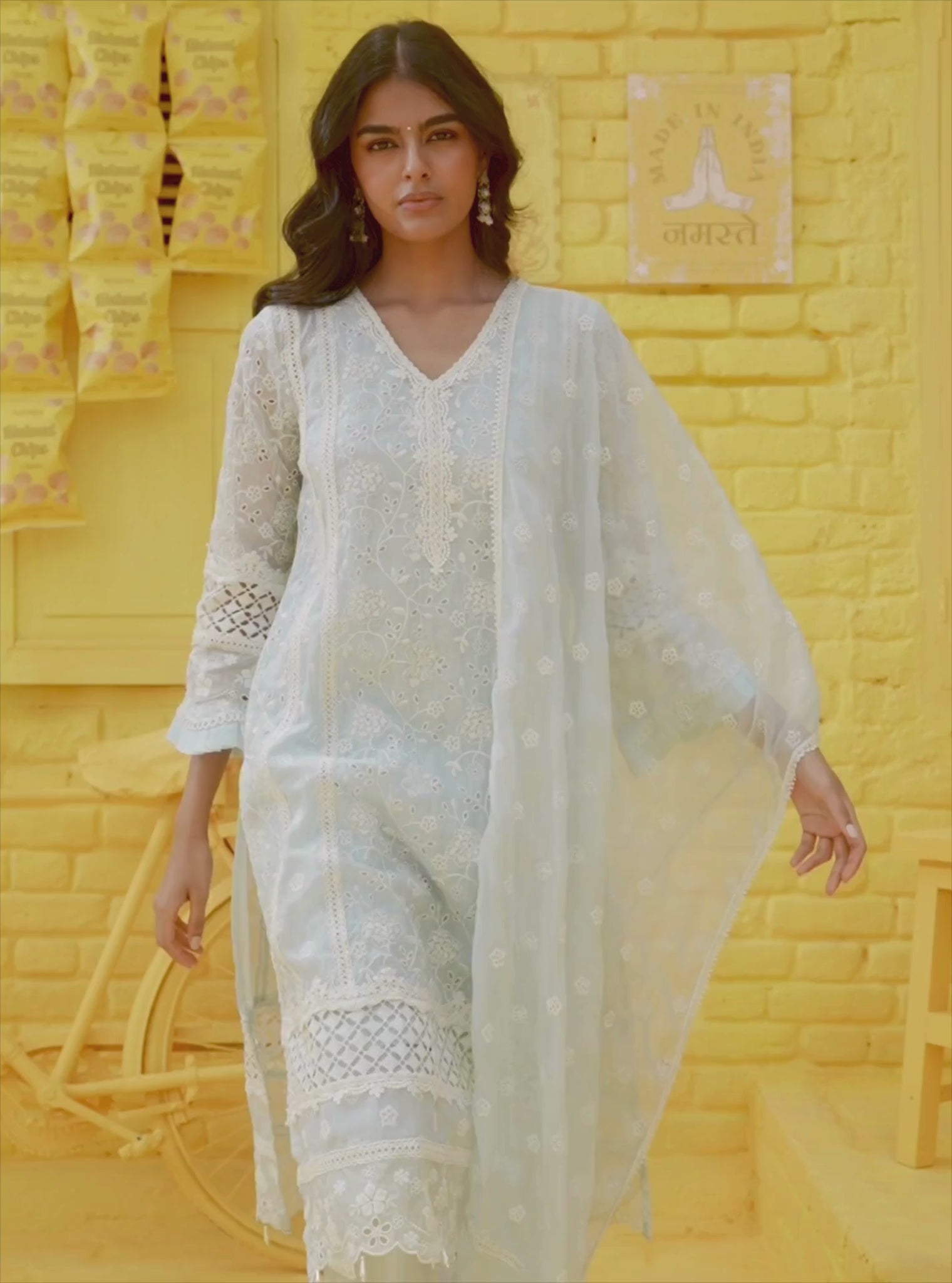 A very delicate and whimsical kurta set in a serene shade of light blue. Delicate white thread embroidery creates a subtle contrast on the base. The V-neckline is adorned with lace trim, while the slightly flared sleeves are pleated and adorned with stunning lace. The hem of the straight kurta is scalloped with dainty pearl hangings. It is paired with straight pants featuring the same lace panel at the cuff. Complete the set with a stunningly embroidered dupatta that adds to the whimsical feel of the ensemble.?ÿ