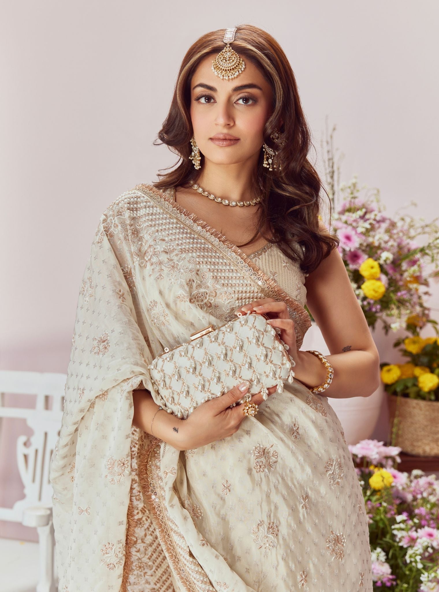 Graceful and timeless, the Mulmul Perla Clutch is designed for those who love subtle luxury. Crafted in a soft white base and adorned with intricate pearl latticework and delicate hanging pearls, this clutch strikes the perfect balance between simplicity and sophistication.