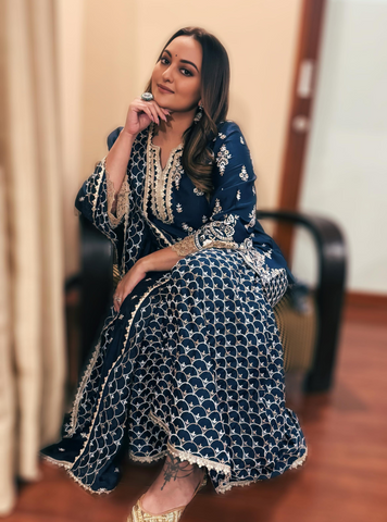A vibrant and fun orange kurta set featuring a straight kurta with shararas. Executed in a lustrous fabric, the kurta features traditional white embroidery all over. The notched neckline is adorned with gotta details. The sleeves and hemline are scalloped while the sleeve is adorned with a pink lace panel, the hemline features delicate pearl danglings. The shararas are intricately embroidered to create a festive look.