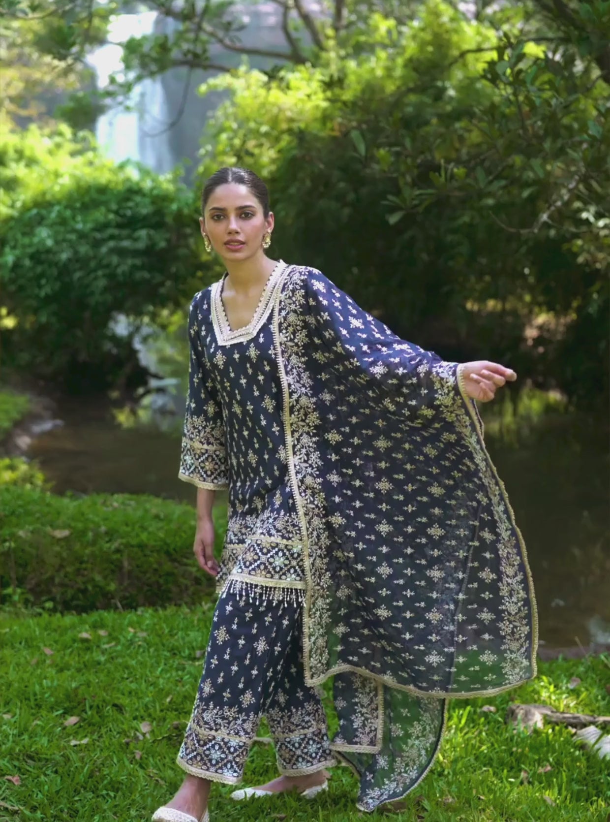 The set is completed with a beautifully embroidered dupatta, featuring intricate patterns and tassel detailing at the edges, adding a subtle statement to the ensemble.