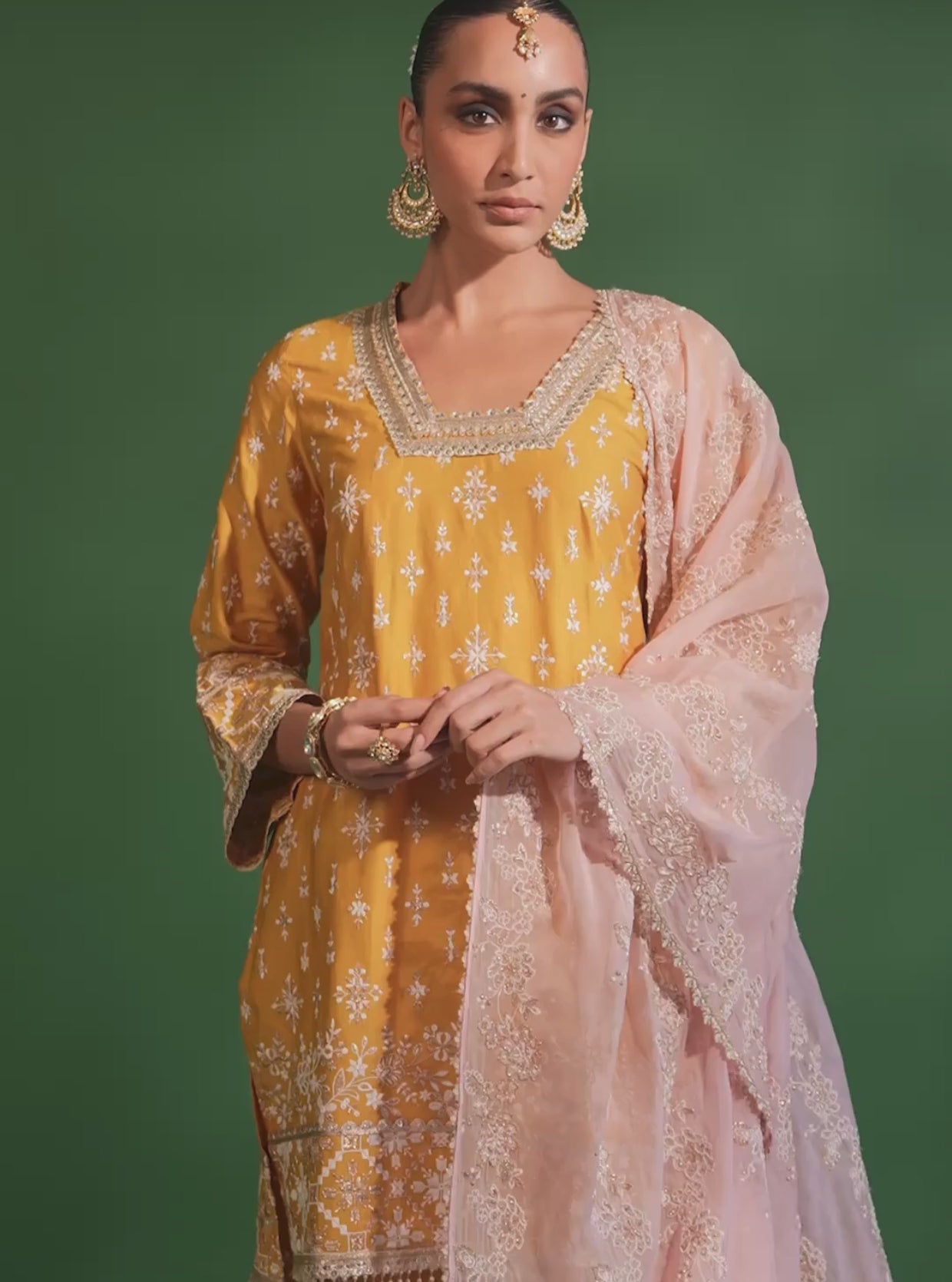 Timeless and elegant, this vibrant kurta set is an embodiment of classic beauty with a touch of grandeur. The straight-cut kurta is adorned with intricate golden motifs, complemented by delicate embroidery along the neckline and borders. The matching straight-fit pants mirror the kurta’s embroidered accents, creating a cohesive and polished look.